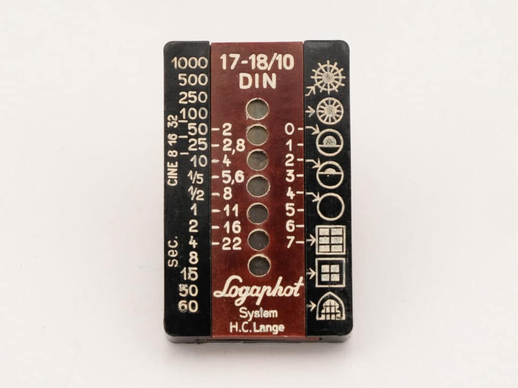 Optischer Belichtungsmesser, Ende der 1930er Jahre. Dieses kleine Gerät verwendet das Messprinzip des transparenten Graukeils, hinter dem eine Zahlenreihe angeordnet