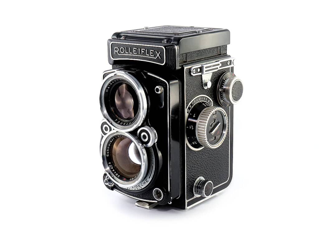 Zweiäugige Spiegelreflexkamera (1952 bis 1955) des Typs Rolleiflex C für 12 Aufnahmen 6 x 6 cm auf 120er Rollfilm. Umbau