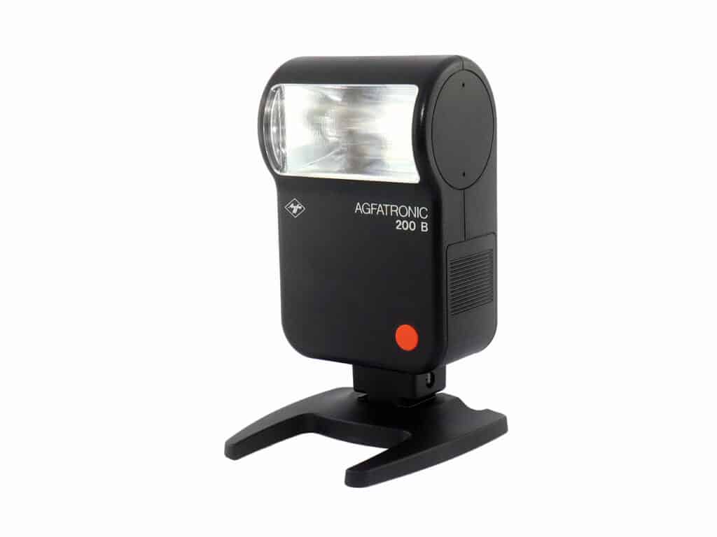 Amateur-Elektronenblitzgerät von Agfa, München, 1973, Leitzahl 20 (bei ISO 100/21 DIN). Blendentabelle (auf der Rückseite) mit einem Bereich von 2,8