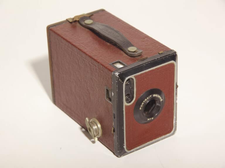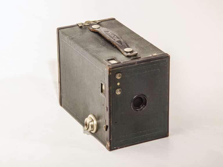 Einfache, aber hübsche Kodak-Brownie-Boxkamera für den Rollfilm 120 (Negativformat 6 x 9 cm). Das Grundmodell wurde ab 1901 in den