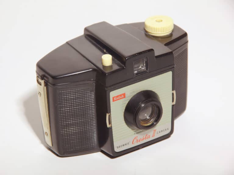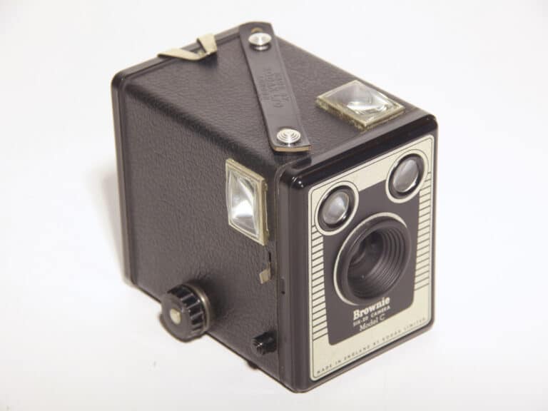 Boxkamera für Rollfilm 120, Format 6 x 6 cm, produziert von Kodak Großbritannien ab 1956 bis etwa 1959. Die Kamera