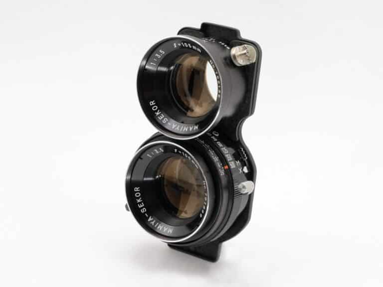 Zweiäugige Spiegelreflexkamera mit Wechselobjektiven für das Negativformat 6 x 6 cm (Rollfilm 120 oder 220), gebaut ab 1965 von Mamiya