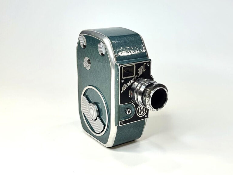 Eine faszinierende Kino-Kamera von 1958 (Neupreis damals mit Zoom-Objektiv Pan Cinor 85: 2.617,– DM). Weitere Eigenschaften: 3,2 Kilogramm schwer, Metallgehäuse, schwarze Belederung, Dreifach-Objektivrevolver, Reflexsucher, Platz