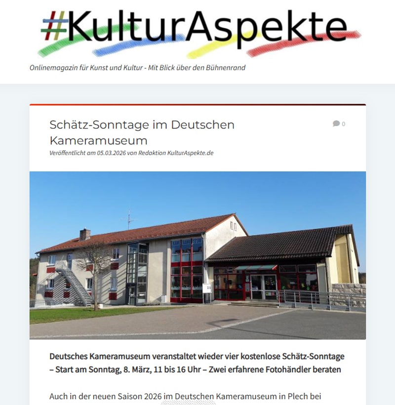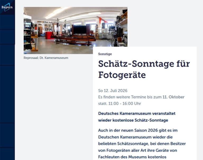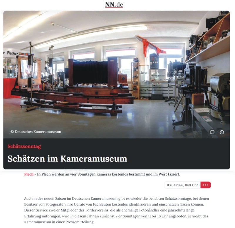 Auch in der Saison 2026 im Deutschen Kameramuseum in Plech gab es wieder die beliebten Schätzsonntage, bei denen Besitzer von Fotogeräten aller Art ihre Geräte von Fachleuten des Museums kostenlos identifizieren und im Wert einschätzen lassen konnten. Eine kleine Auswahl der Presseankündigungen.