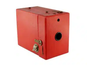 Auffällige Boxkamera aus Karton für den 120er-Rollfilm, gebaut in den verschiedensten Farben von Kodak, USA, von 1930 bis 1933. Meniskus-Linse, Einfachverschluss. Auffällig: nur ein Brillantsucher mittig oberhalb des Objektivs. Keine weiteren Einstellmöglichkeiten. […]