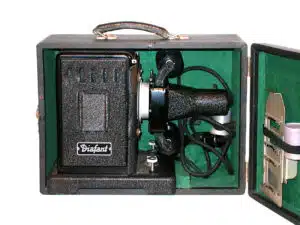 Stattlicher Projektor für das Kleinbildformat, Diarähmchen: 5 x 5 cm, der Firma Ed. Liesegang oHG, Düsseldorf, Baujahr etwa 1933. Schwenkbare Bildbühne, in die wahlweise ein 2-fach-Diaschieber oder ein Rollenhalter für 35 mm […]