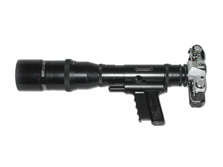 Novoflex-Schnellschuss-Objektiv B mit 1:9/640 mm mit Pistolengriff B, Auflagebügel, Leica-M-Anschluss und Schulterstativ. 1970er Jahre. Die Entfernungseinstellung geschah blitzschnell durch Zusammendrücken oder Loslassen des beweglichen Teils