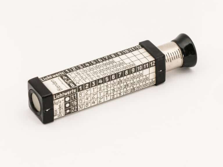 Optischer Belichtungsmesser vom Platin-Werk Gerhard Räder, Neukirchen/Erzgebirge, ab etwa 1960. Das Licht tritt an der Stirnseite ein und wird im hinteren Bereich über einen Spiegel
