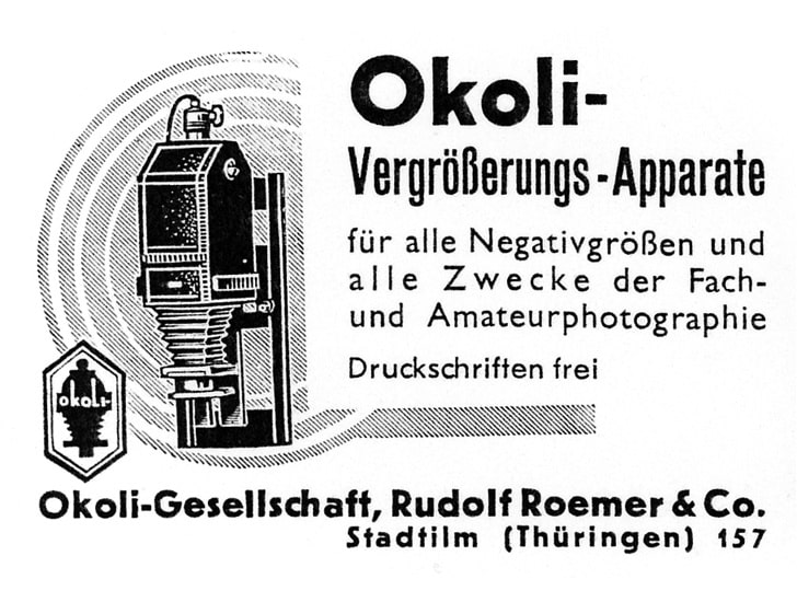 Okoli-Gesellschaft, Rudolf Roemer & Co., Stadtilm, Thüringen (1920 bis mindestens Ende der 1950er Jahre). Hersteller von Reprokameras und Vergrößerungsgeräten. Stadtilm ist eine Kleinstadt im Ilm-Kreis in der Mitte von Thüringen, rund 30 Kilometer südlich von Erfurt.