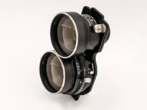 Eine zweiäugige Spiegelreflexkamera mit Wechselobjektiven aus japanischer Produktion für das Negativformat 6 x 6 cm (Rollfilm 120 oder 220), gebaut von 1972 bis 1982. Ausstattung: