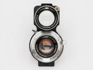 Doppeläugige Spiegelreflexkamera (TLR) für den Rollfilm 120 (Aufnahmeformat 6 x 6 cm), hergestellt in Deutschland von 1938 bis 1951. Aufnahmeobjektiv: Carl Zeiss Jena Triotar 1:3,5/7,5