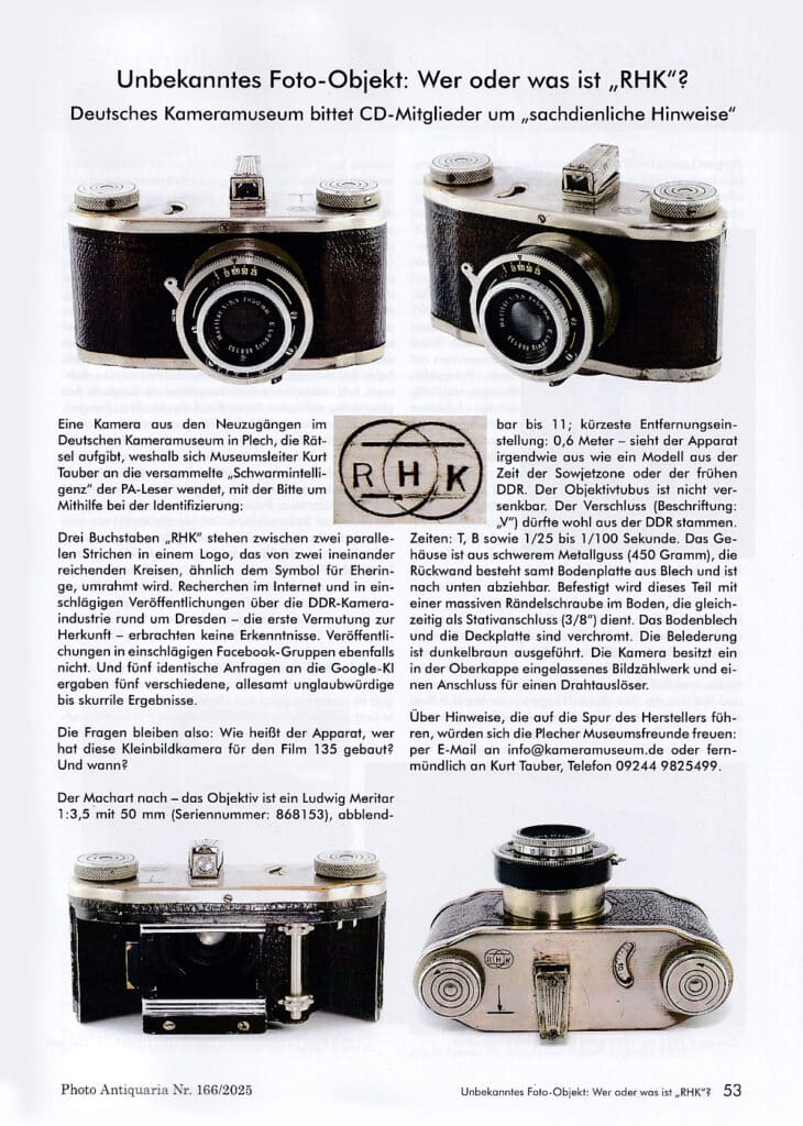 Mitunter erreichen das Deutsche Kameramuseum in Plech Photographica-Spenden, die Rätsel aufgeben: Wer ist der Hersteller? Wann kam das Ding auf den Markt? Wie funktioniert das? Und manchmal sogar: Wozu ist das Exponat überhaupt gut? Meist werden diese Rätsel durch intensive Recherche in Fachbüchern und im World Wide Web umgehend gelöst, aber es gibt auch Fragen, die entziehen sich über Wochen und Monate einer plausiblen Antwort. So ein Beispiel ist diese Kleinbild-Kamera, auf der nur das Firmenzeichen(?) „RHK“ zu entdecken ist. Die renommierte Sammler-Vereinigung „Club Daguerre“ hat diesem Thema in der Clubzeitschrift „Photo Antiquaria“ im Heft 166 vom Dezember 2025 eine Seite eingeräumt, in der Museumsleiter Tauber, den Mitgliedern den Neuzugang präsentieren durfte.
