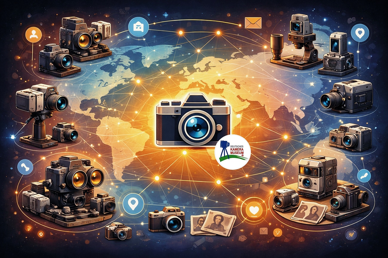 Im Laufe der Jahre hat das Deutsche Kameramuseum naturgemäß viele Kontakte auf- und ausgebaut zu Sammlern, Photographica-Vereinigungen, den Medien, anderen Foto- oder Filmmuseen oder Händlern. Wir haben viel uneigennützige Unterstützung erfahren und helfen selbstverständlich immer gerne, wenn Fotos oder Dokumente aus unserem Bild- und Textarchiv gefragt sind. So ergab sich ein weltweites Netzwerk, das die künstliche Intelligenz im April 2026 wie oben im Bild visualisiert hat.