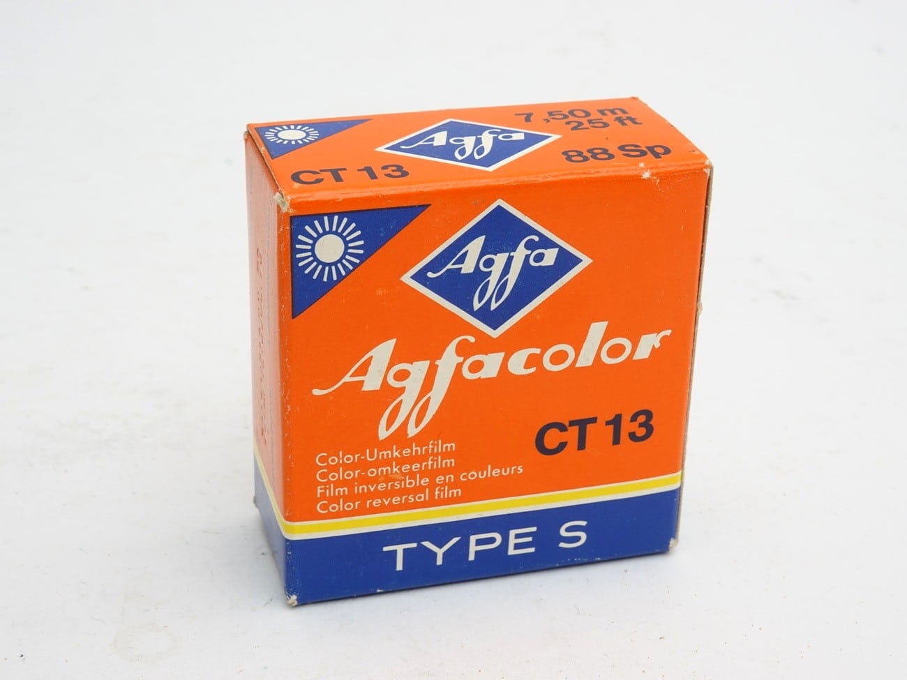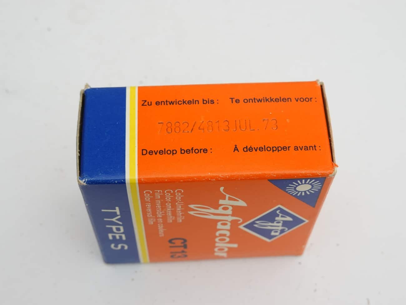 Color-Umkehrfilm, 7,5 Meter; für Tageslichtaufnahmen; Filmempfindlichkeit: 13 DIN/16 ASA. Hergestellt in Westdeutschland; zu entwickeln bis Juli 1973. Filmspule in Metalldose, Gebrauchsanleitung, Entwicklungshinweis und Adressen des Agfacolor-Umkehrdienstes, Versandbeutel; Zettel für die eigene Anschrift; Karton.