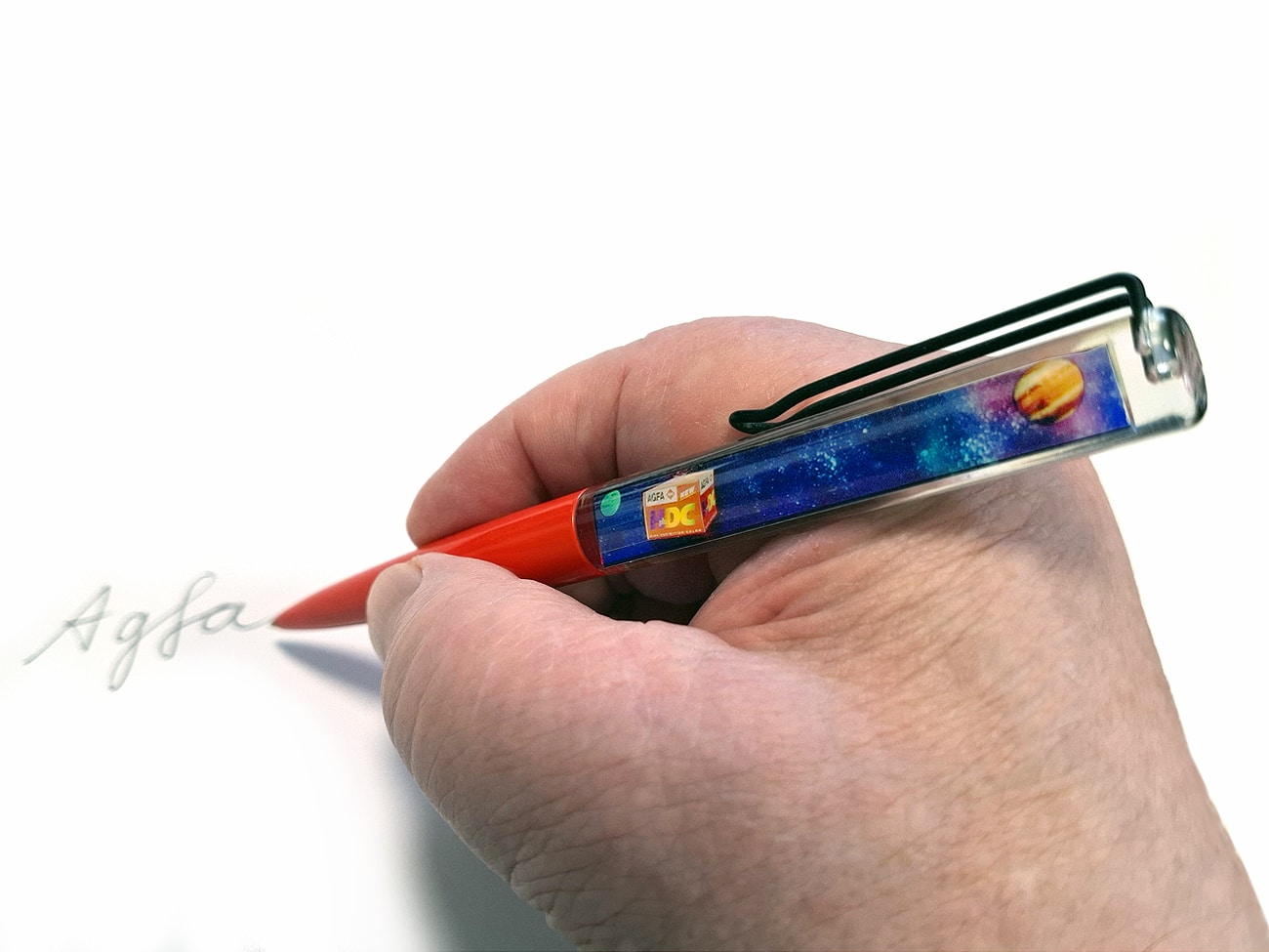Werbeartikel für den Agfa Farbnegativfilm HDC Plus (1990er Jahre). Der etwa 14,5 cm lange Kugelschreiber ist im Oberteil mit einer Flüssigkeit gefüllt, in der die stilisierte Filmpackung beim Schreiben infolge der Schwerkraft langsam nach unten sinkt (Bild). Hält man den Kuli so, dass die Spitze nach oben zeigt, bewegt sich die „Filmschachtel“ wieder in die Ausgangsposition zurück.