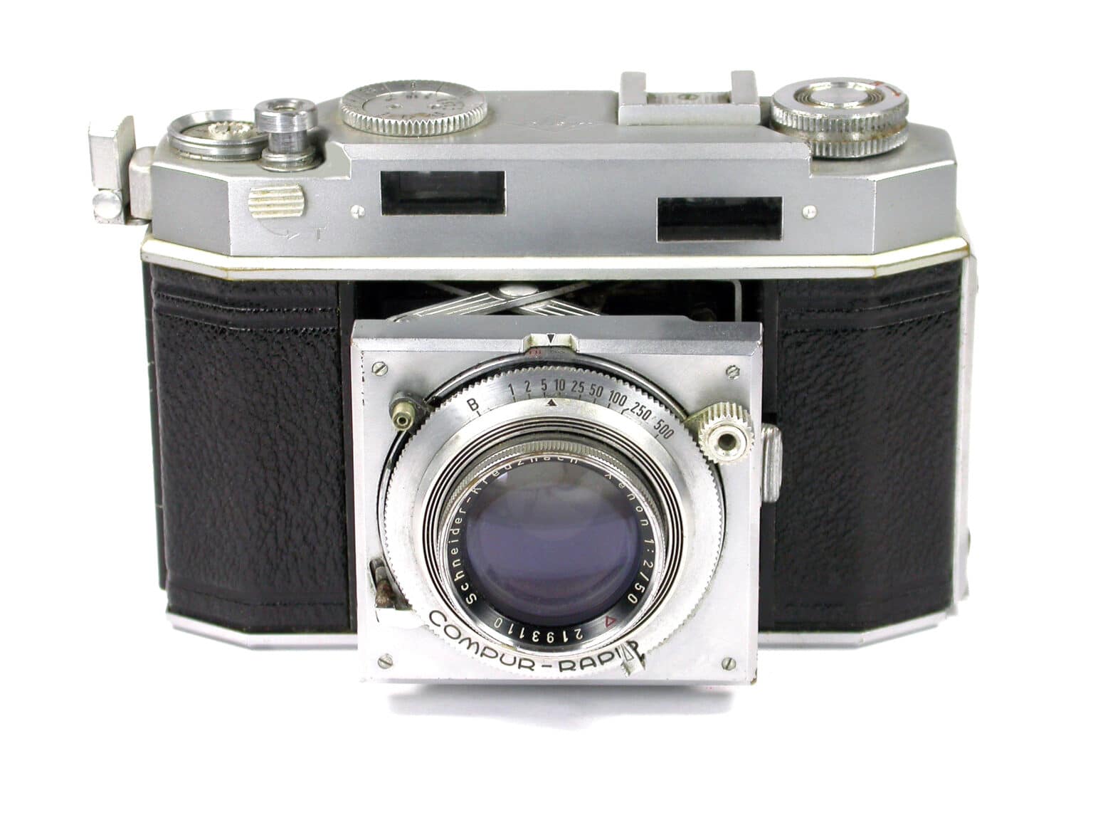 Messsucherkamera aus der Karat-Reihe für den Kleinbildfilm 135 in der Standardpatrone (Negativformat 24 x 36 mm). Dies hier ist die Exportausführung der Karat 36. Objektiv: Schneider-Kreuznach Karat Xenon 1:2,o/50 mm, vergütet, Nr. 2193110 (Bild). Newton-/Fernrohrsucher mit gekuppeltem Entfernungsmesser. Verschluss: Compur-Rapid (B, 1 bis 1/500 Sekunde). Die Kamera war auch wahlweise mit einem Heligon 1:2,0/50 mm oder einem Xenar 1:2,8/50 mm zu haben.