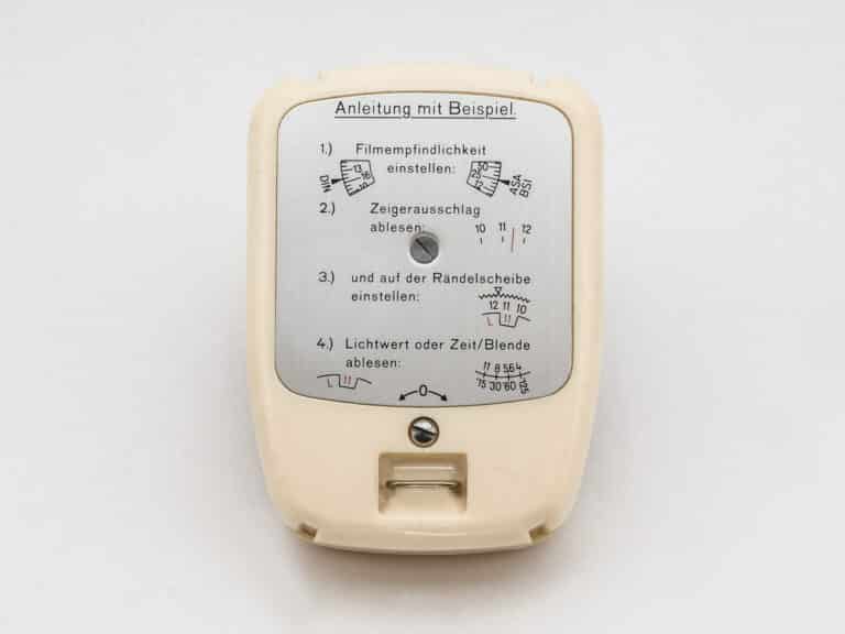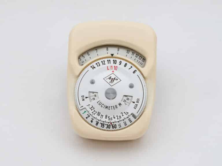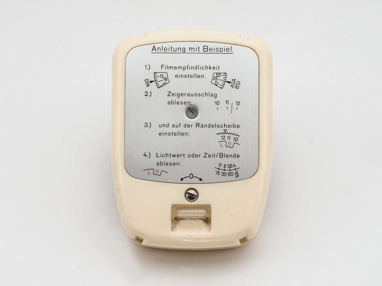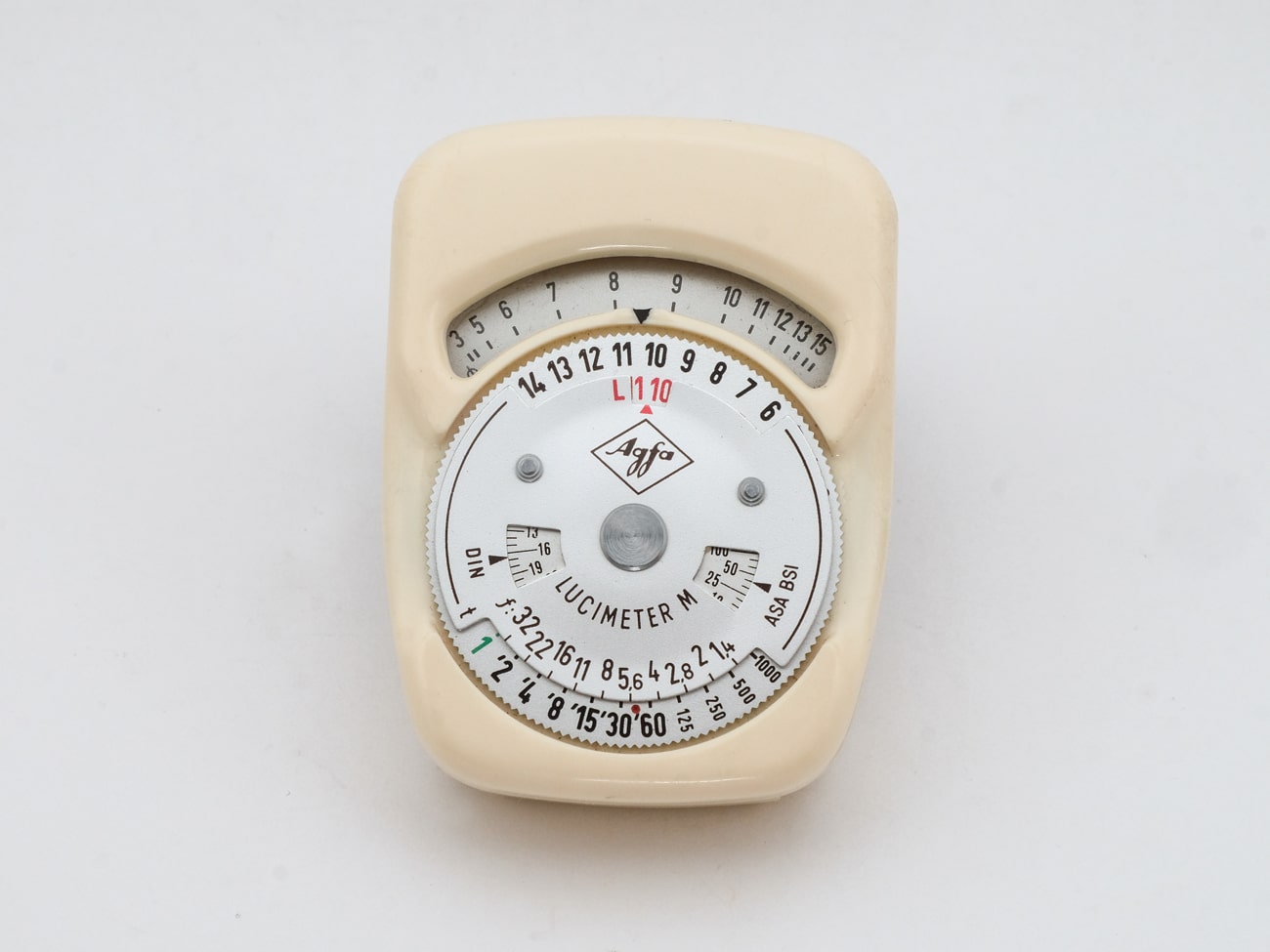 Belichtungsmesser mit Selenzelle von Agfa ab etwa 1957, Vorläufer des kurz danach erschienenen Lucimeter S. Die Selenzelle erzeugt entsprechend der Helligkeit einen elektrischen Strom, der zur Ansteuerung des Zeigerinstruments verwendet wird, eine zusätzliche Stromquelle ist nicht erforderlich. Für die Messung wird der abgelesene Wert der Zeigerskala mit dem Drehrad auf die obere schwarze Skala übertragen. Unten können dann die Blenden-/Zeit-Kombinationen, im kleinen Fenster oben in rot die Lichtwerte abgelesen werden. Für die Lichtmessung steht eine aufsteckbare Scheibe zur Verfügung. Die Zeigerskala weicht geringfügig von der Lichtwertskala ab. Die Messbereiche: Zeiten 1/1.000 Sekunde bis 15 Sekunden, Blenden 1,4 bis 32, Empfindlichkeiten DIN 9 bis 32/ASA 6 bis 1.250, Lichtwerte EV 1 bis 18.