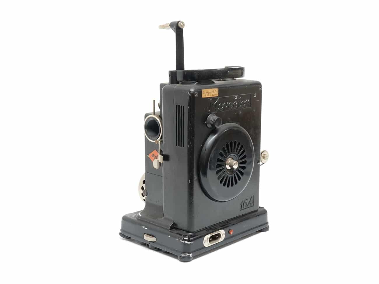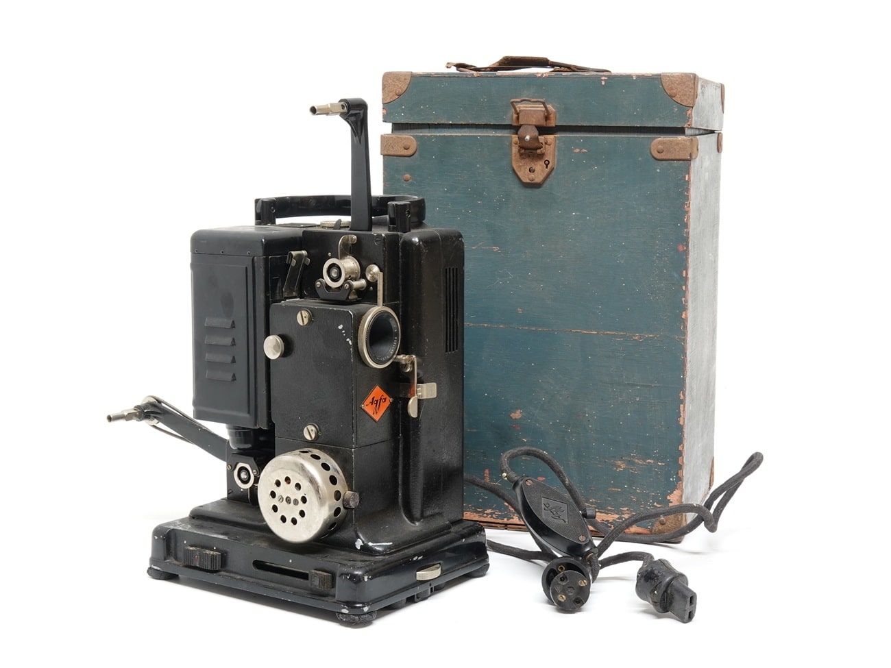 16-mm-Filmprojektor von Agfa, 1928. Objektiv: Agfa Ocellar 3,5 cm, Seriennummer P 10227. Elektrischer Filmtransport, Filmlänge: maximal 120 Meter. Lampe (laut Aufkleber vom 15.05.1962): 220 Volt/250 Watt. Netzspannung 110/220 Volt. Im Museum mit originalem Anschlusskabel und Transportkoffer.