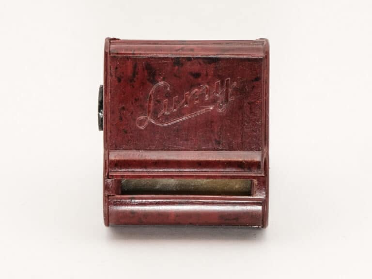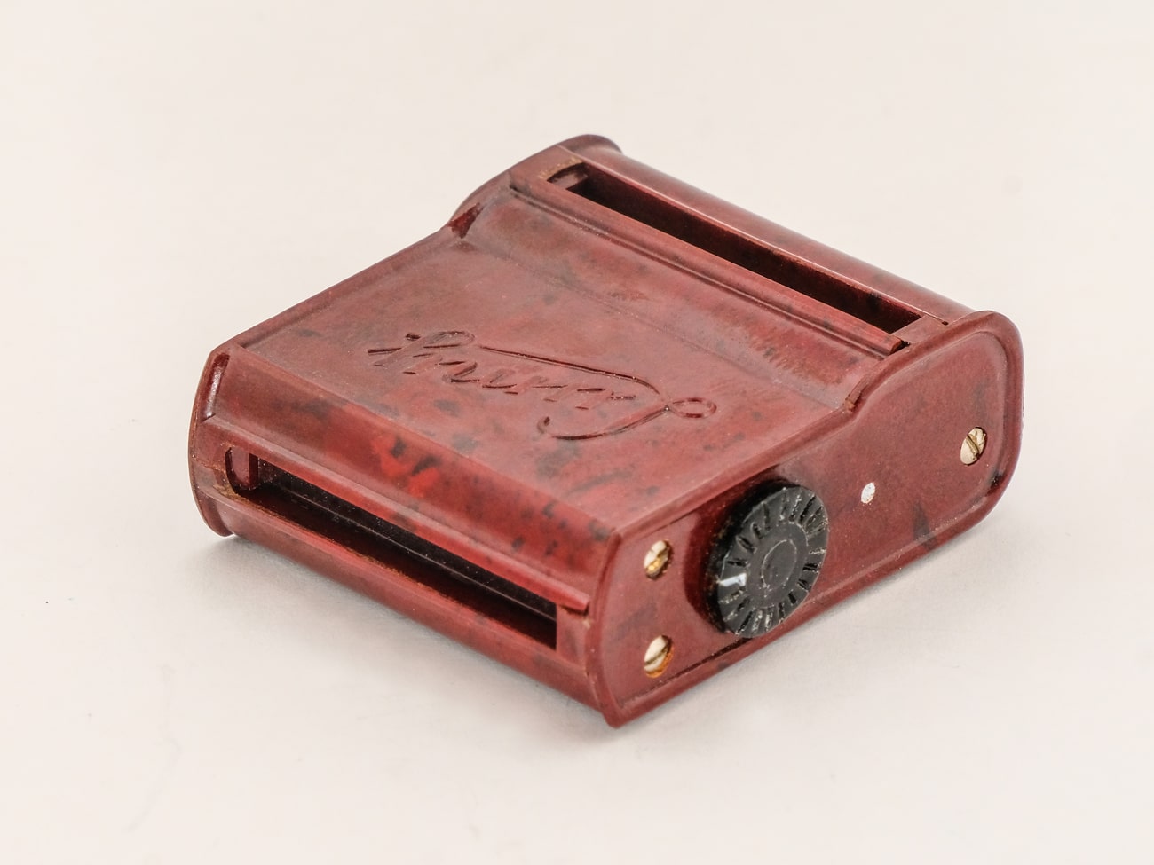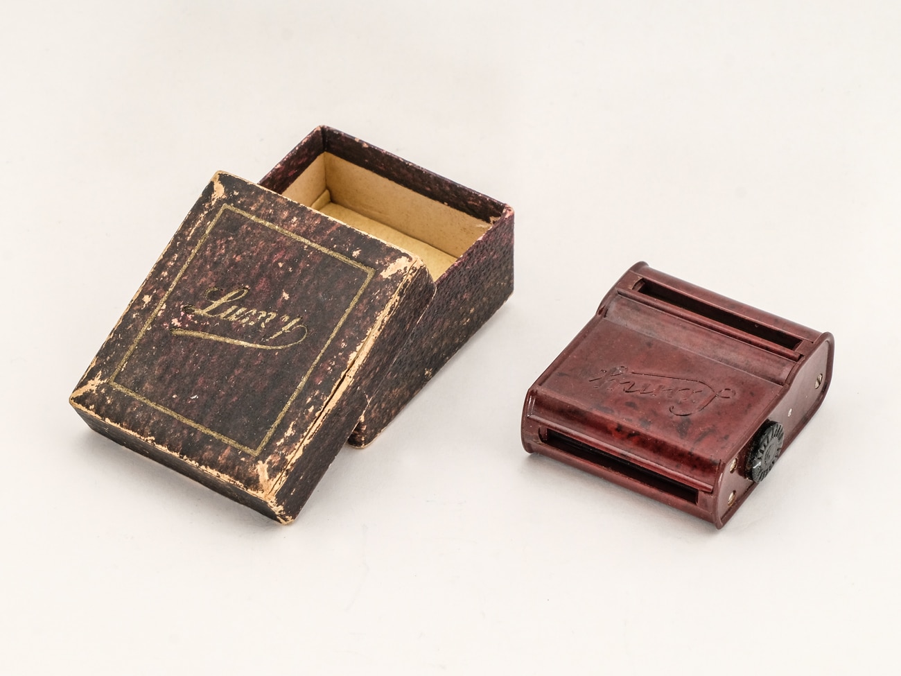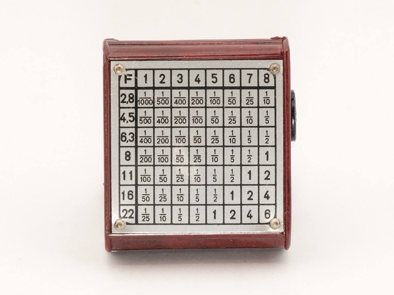 Optischer Belichtungsmesser der Firma Karl Arnold, Marienberg, etwa 1939. Das Messprinzip verwendet einen transparenten Graukeil mit Ziffern 1 bis 8. Mit der gerade noch erkennbaren Ziffer werden anhand der auf der Rückseite angebrachten Tabelle die passenden Belichtungswerte ermittelt. Der Einblick erfolgt von oben in den Schlitz an der Schmalseite, der zweite Schlitz am unteren Rand der Breitseite wird in Messrichtung gehalten. Mit dem seitlichen Drehknopf lässt sich innen ein Graufilter zu-/abschalten, was einer Wahl zwischen 15 DIN und 18 DIN entspricht.