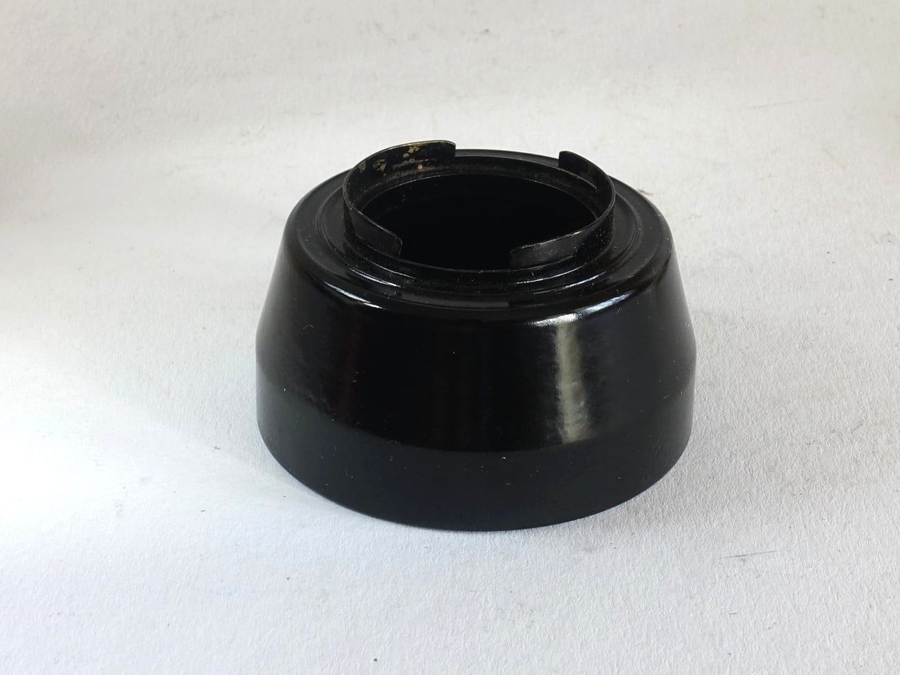 Sonnenblende aus Bakelit mit Steckfassung (30,5 mm), hergestellt in der DDR Ende der 1950er Jahre. Im Museum mit Informationsblatt im Originalkarton. Mit Bleistift notierter, damaliger Verkaufspreis: 2,05 Mark.
