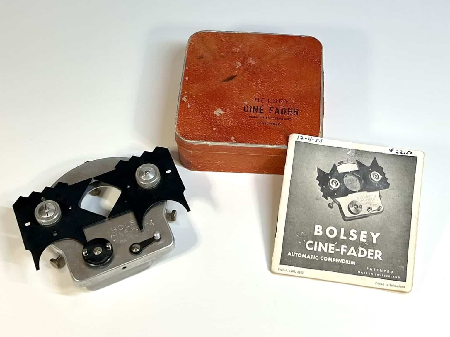 Der Bolsey Cine-Fader ist eine mechanische, federbetriebene Vorrichtung, die einfach an der Außenseite des Objektivs einer prinzipiell beliebigen 16-mm- oder 8-mm-Filmkamera montiert wird. Diese Vorrichtung ermöglicht automatische Ein- oder Aus-Blendungen (Fades) beim Filmen.