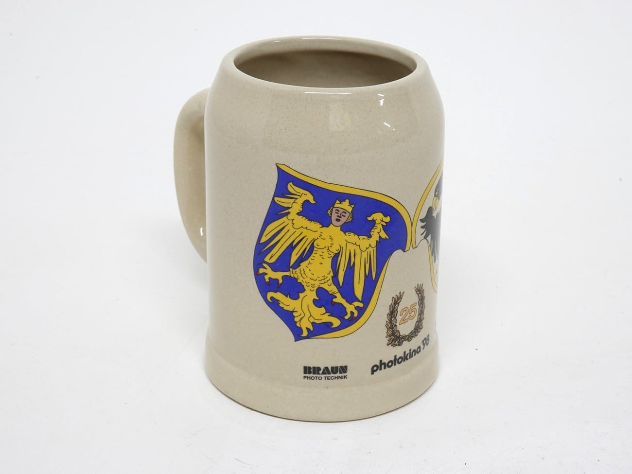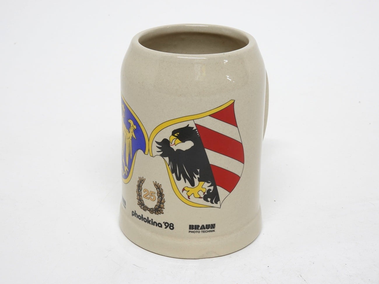 Bierkrug (0,5 Liter) aus Steingut mit Großem und Kleinem Wappen der Stadt Nürnberg, dem Unternehmenssitz des weltbekannten Fotogeräteherstellers Carl Braun, dazu im Lorbeerkranz die Zahl 25. Die Photokina wurde seit 1950 – zunächst in unregelmäßigen Abständen, ab 1966 im Zwei-Jahres-Turnus – veranstaltet, so dass sie 1998 zum 25. Mal stattfand; Veranstaltungsort war jeweils Köln. Auf der – letzten – Photokina 2018 stellten 812 Unternehmen, davon 69 Prozent aus dem Ausland, ihre Produkte und Dienstleistungen vor. Es kamen rund 180.000 Besucher aus 127 Ländern. Danach gelang es trotz verschiedener Versuche und Ankündigungen nicht mehr, die Photokina wiederzubeleben.