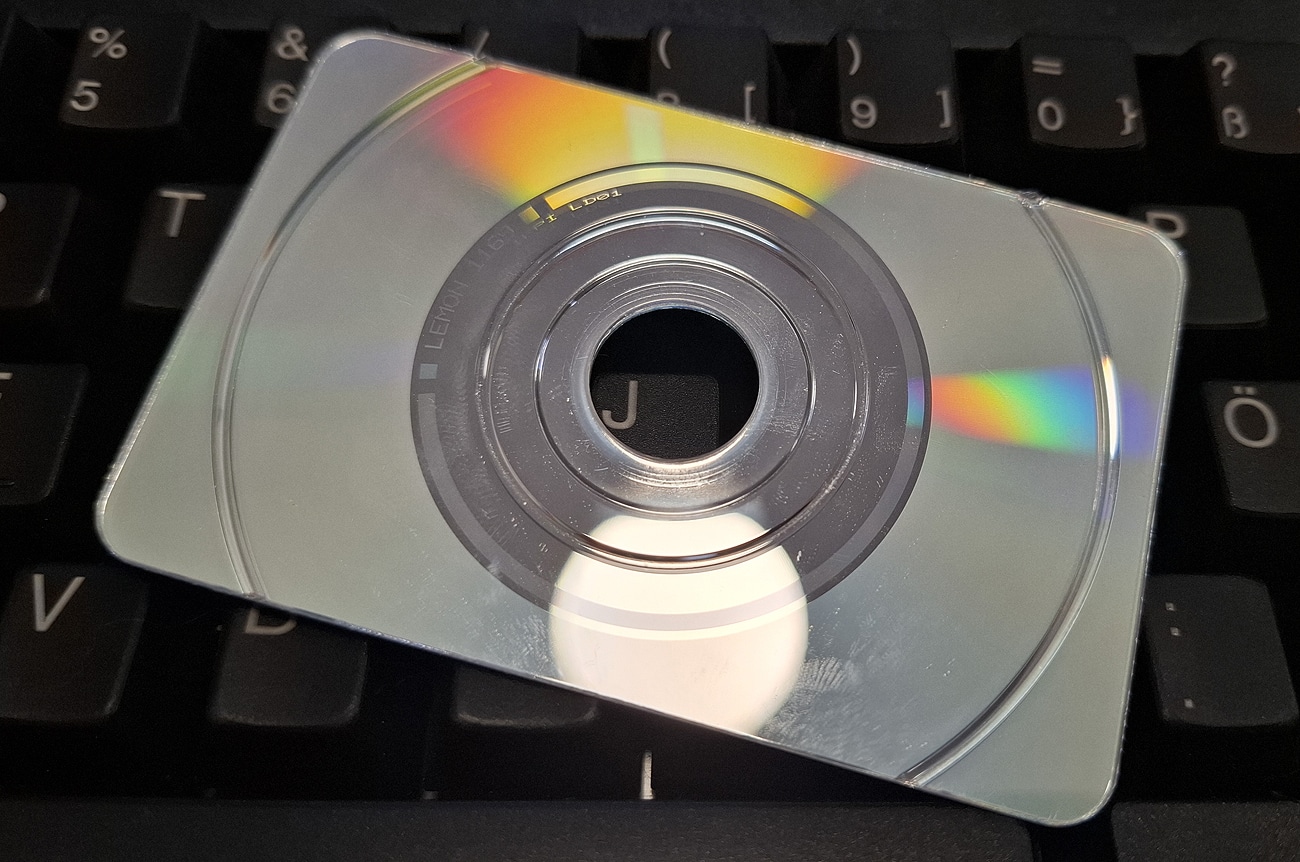 Was es nicht alles gab! Eine Kamera Canon Digital IXUS auf den ersten Blick. Aber so flach und mit so rauer Oberfläche? Und durchs Objektiv sieht man die Tastatur? Natürlich nicht, sondern eine PR-Idee der Canon- Werbeleute aus der guten alten Zeit, wo man noch keine Angst vor den Kameras in den Smartphones haben musste und die Werbeetats noch prall gefüllt waren. Statt eines gedruckten Prospekts verteilte man scheckkartengroße Mini-CD-ROMS in der äußeren Gestalt besagter IXUS.