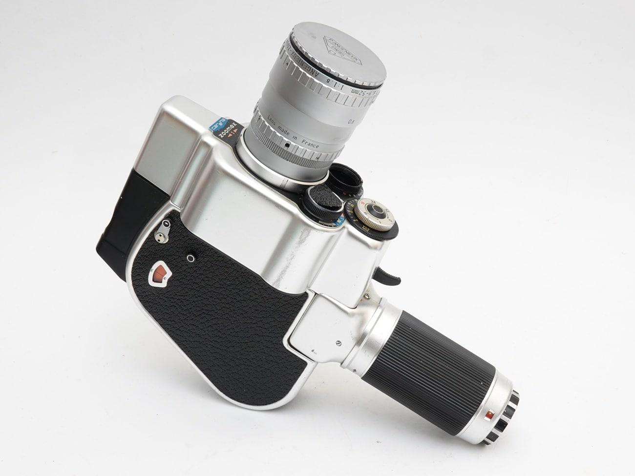 Schmalfilmkamera für Doppel-8-Spulen, hergestellt ab 1964 von Carena, Liechtenstein/Schweiz. Objektiv: Angénieux-Zoom Type 8 x 6,5 B (1:1,8/6,5-52 mm; Seriennummer 1116086); manuelle Fokussierung und Brennweitenverstellung. Parallaxenfreier Reflexsucher mit Blendenanzeige. Federwerksantrieb (Einzelbild; 11, 18, 24 und 32 Bilder pro Sekunde); Aufziehen des Federwerks durch Drehen des Handgriffs. Mit optischer Federspannungsanzeige und Warnton, sobald die Reserve die Grenze von 20 cm Filmdurchzug erreicht. CdS-Belichtungsmessung durch separates Fenster; automatische oder manuelle Belichtung. Damaliger Verkaufspreis: 1.490 DM. Zum Vergleich: 1964 betrug der durchschnittliche Bruttolohn eines westdeutschen Arbeitnehmers laut Statistischem Bundesamt 418 DM.
