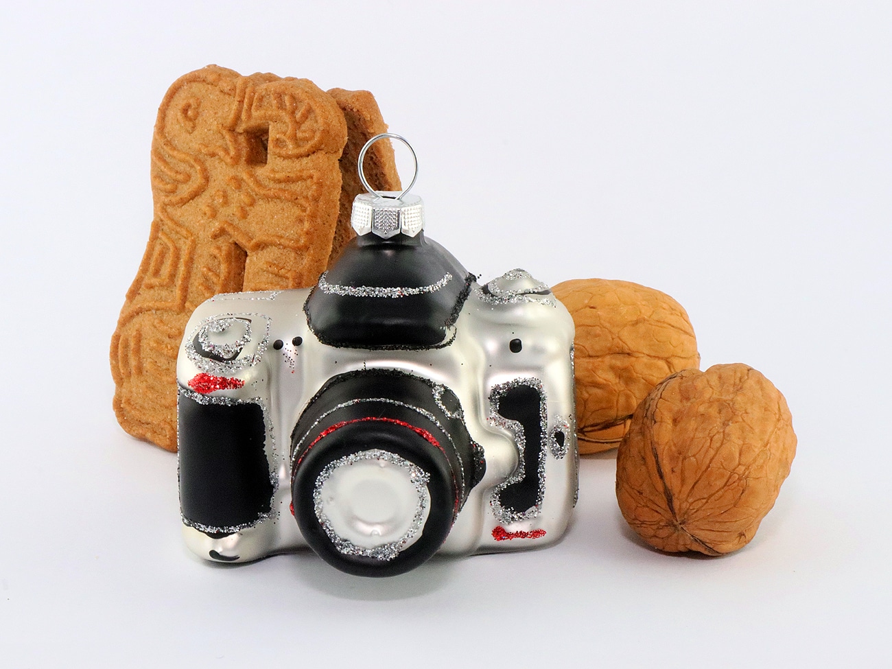 Eine „Spiegelreflexkamera“, Baujahr 2025, die nicht jeder hat. Pünktlich zum Weihnachtsfest hat eine deutsche Firma diese entzückende Christbaumkugel in Gestalt einer DSLR als Sonderserie auf den Markt gebracht und damit Sammler von von Foto-Gimmicks erfreut. Was auf dem Foto und selbst auf den Videos unten nicht so deutlich wird: Das 6,5 x 6,5 x 5,5 cm große Ding blitzt und blinkt im Licht wie ein Geschmeide aus Strass-Steinen – ein Hingucker an jedem Christbaum.