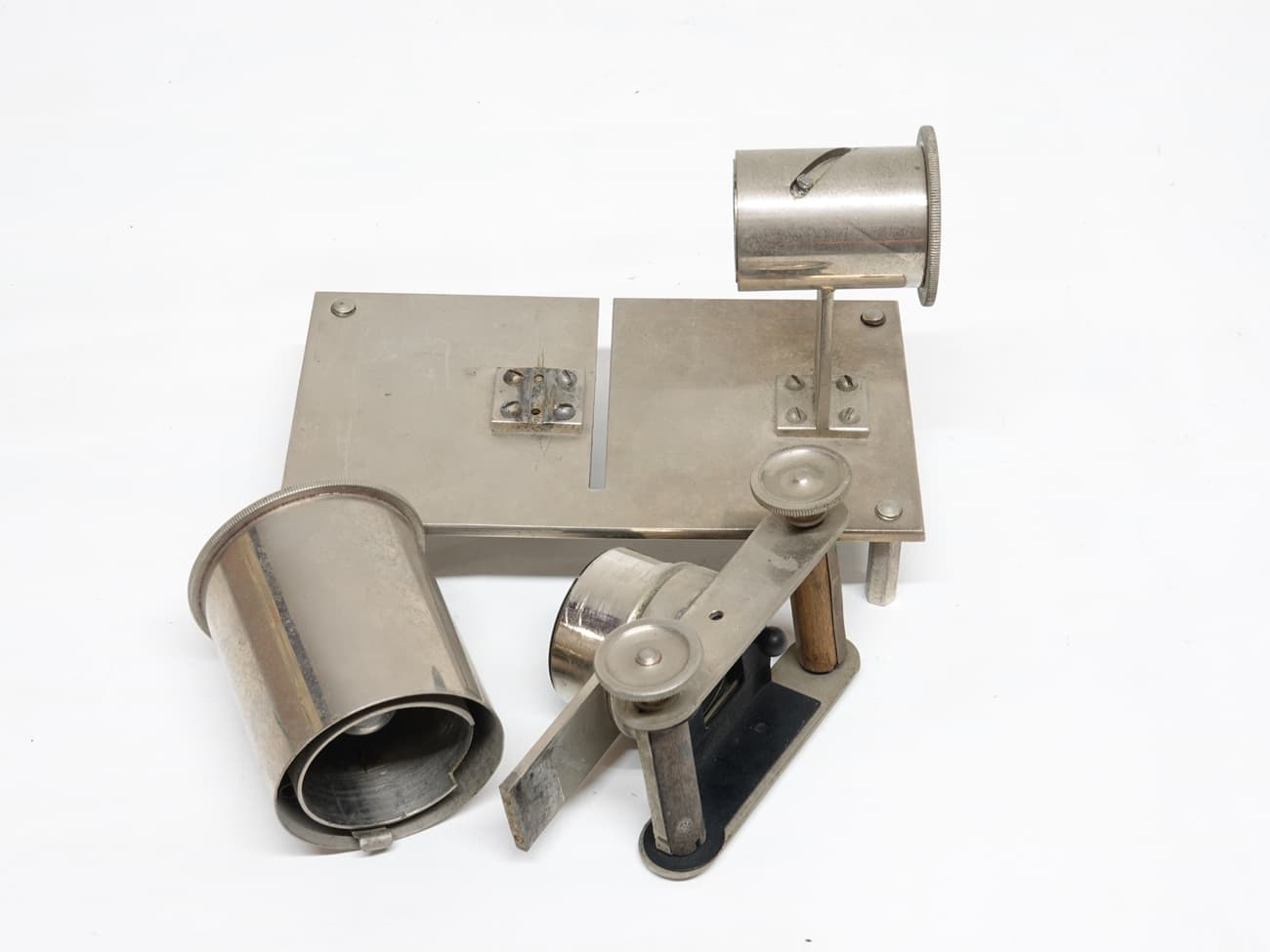 Ein Diaprojektor für Filmbänder im Kleinbildformat, vermutlich von einem begabten Bastler unter Verwendung vorhandener Einzelteile erstellt. Objektiv manuell fokussierbar. Keine Datierung möglich. Der Ständer für Lampenhaus und Bildbandhalter ist abgebrochen; der elektrische Anschluss am Lampenhaus fehlt. Und so war die Anordnung der Bestandteile gedacht: links das Lampenhaus, dann die Spulen für das Bildband und schließlich das Objektiv.