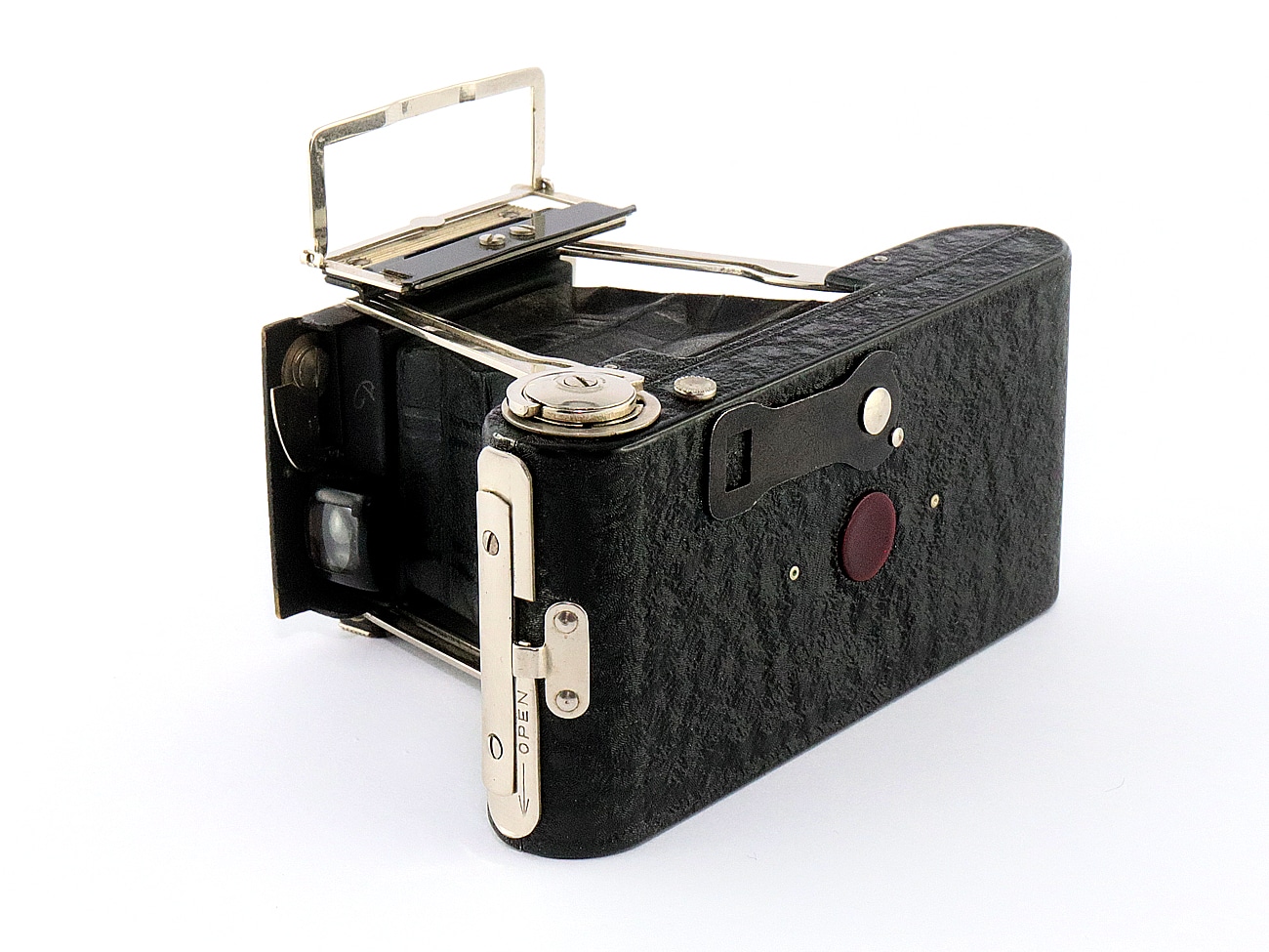 Die Kamera hat zwei Blendenstufen: eine mit der Bezeichnung „SMALL“ (Blende 16) und eine mit der Bezeichnung „LARGE“ (1:11). Der Verschluss (T und B) weist Verschlusszeiten von 1/25, 1/50 und 1/100 Sekunde auf, die unterhalb des Objektivs eingestellt werden. Das in England sogar patentierte Fixfokus-Objektiv hat eine Brennweite von 55 mm und trägt die Seriennummer 271186. Für Hochaufnahmen lässt sich eine Metallstütze ausklappen.