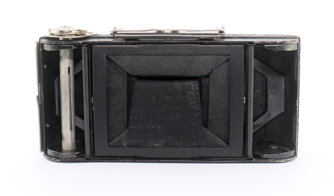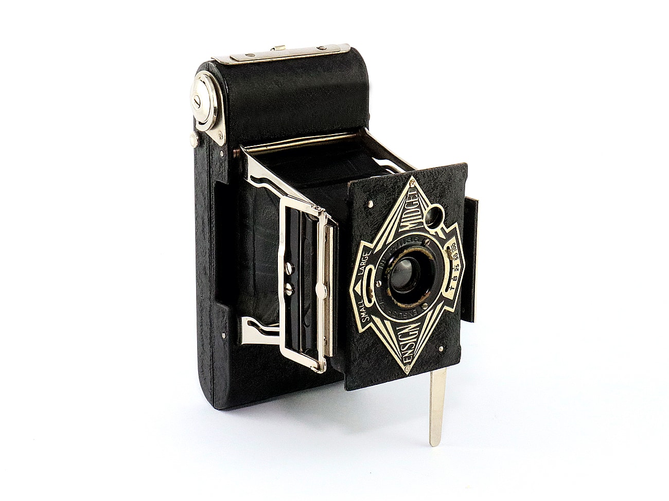 Eine Miniaturkamera des altehrwürdigen Londoner Herstellers Houghton-Butcher auf Rollfilm E 10 (Filmbreite 35 mm; 6 Aufnahmen 3 x 4 cm pro Spule). Gebaut wurde der Fotoapparat im Art-déco-Stil mit dem typischen eckigen-geometrischen Design der Frontplatte von 1934 bis etwa 1941. Das Gehäuse aus Stahlblech verfügt über konische Stützstreben, die sich im Gehäuse versenken lassen. Im ausgeklappten Zustand fixieren die Streben die Frontplatte.
