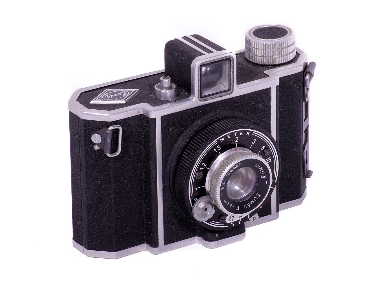 Heute wie damals seltene Sucherkamera für den Rollfilm 120 (12 Aufnahmen im Format 6 x 6 cm), hergestellt in Österreich 1951 und 1952 in nur 9.600 Exemplaren. Objektiv: Eumig Eumar 1:5,6/8 cm (Seriennummer 100699), ein Dreilinser, das erste von Eumig hergestellte Objektiv. Bekannt ist Eumig aber vor allem als Produzent von Schmalfilmkameras und -projektoren sowie von Radiogeräten. Metallgehäuse, der Tubus ist herausziehbar. Blitzanschluss, aber kein Zubehörschuh mit Mittenkontakt. Der Auslöser mit integriertem Drahtauslösergewinde befindet sich neben dem oben angebrachten umgekehrten Galilei-Sucher, der mittig direkt über dem Objektiv positioniert ist.