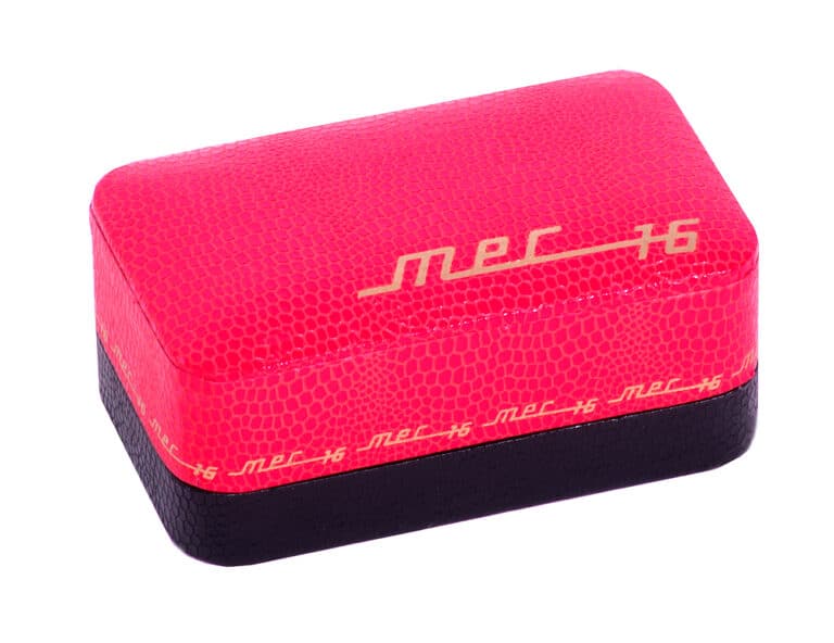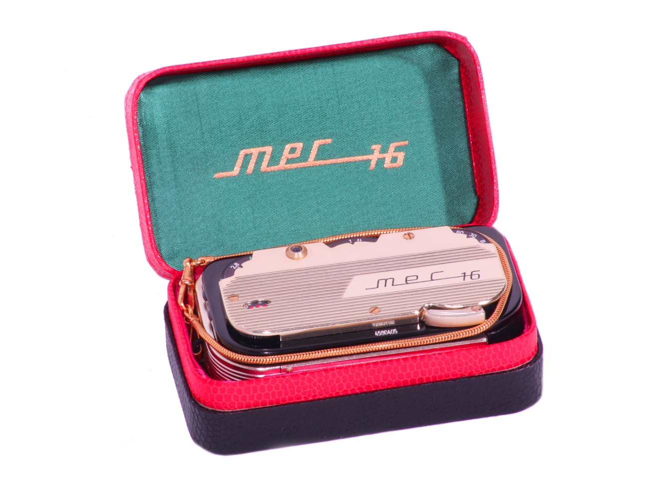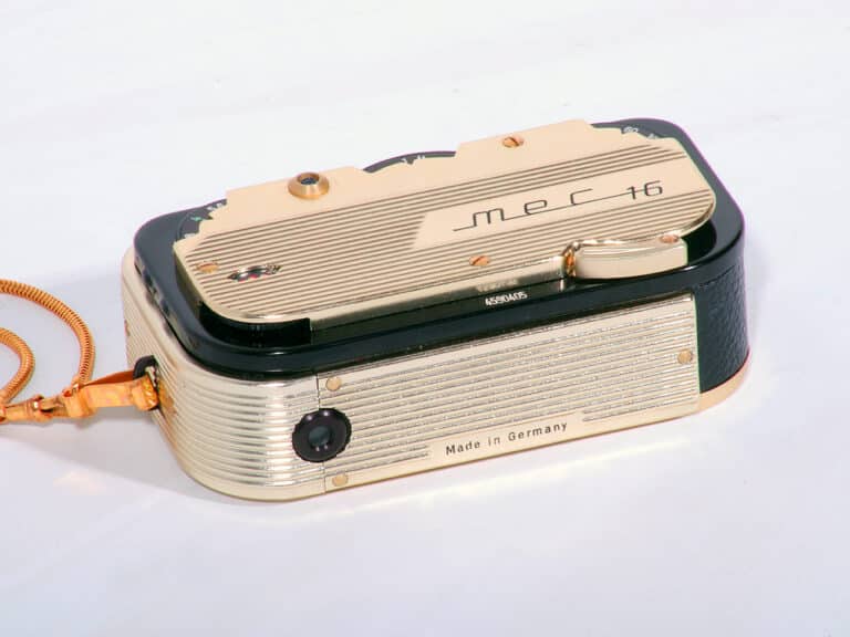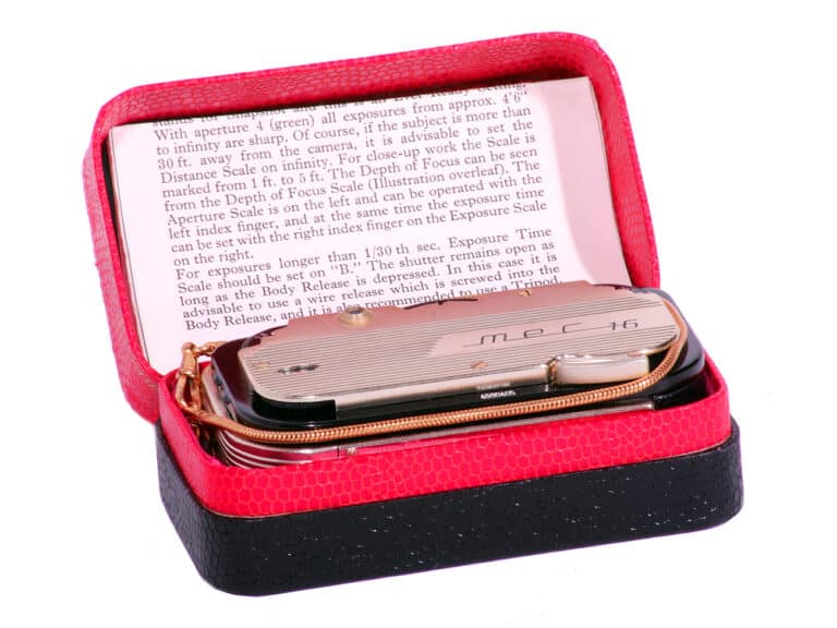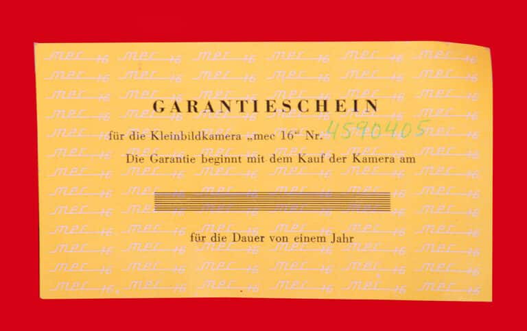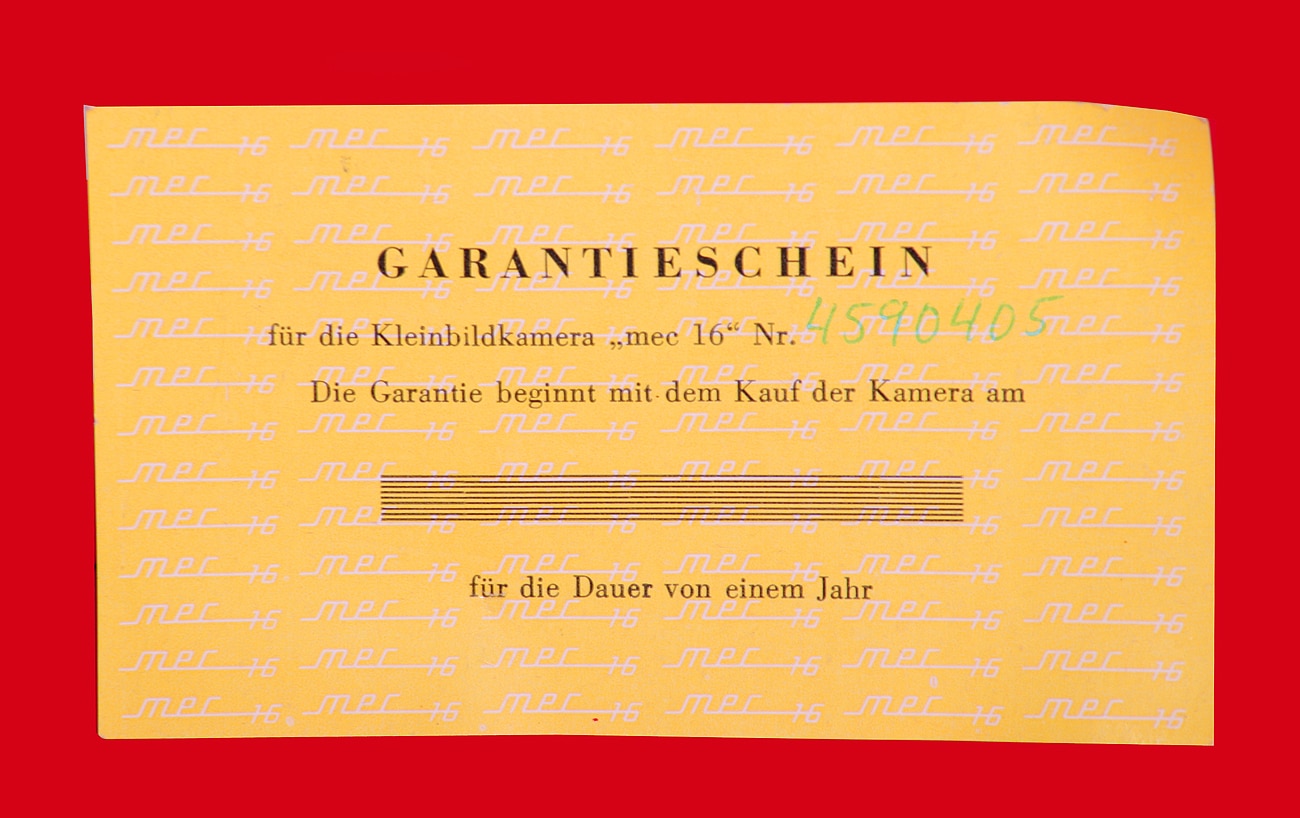 Kleinstbildkamera Mec 16 (1956) der Feinwerktechnik GmbH, Lahr (Schwarzwald) im originalen Komplettset mit Etui, Kette, Bedienungsanleitung und Garantiekarte. 190 Gramm schwer, nur 10 x 5,6 x 3,4 Zentimeter groß. Die Einstellelemente für Blende, Entfernung, Verschlusszeit und der Spannhebel (Schnellaufzug) befinden sich in einer Ebene, liegen damit im Blickfeld.