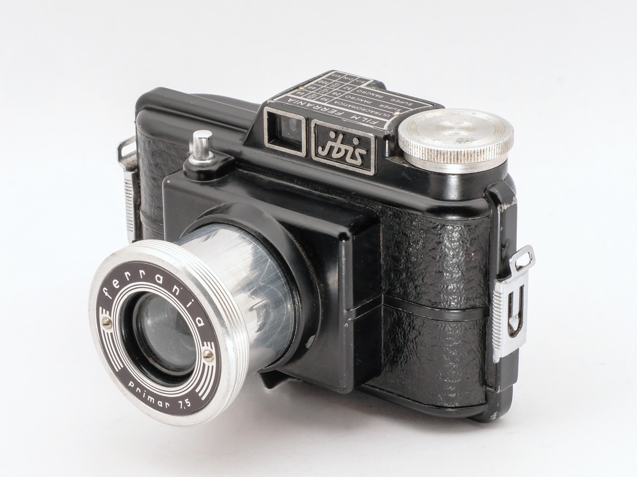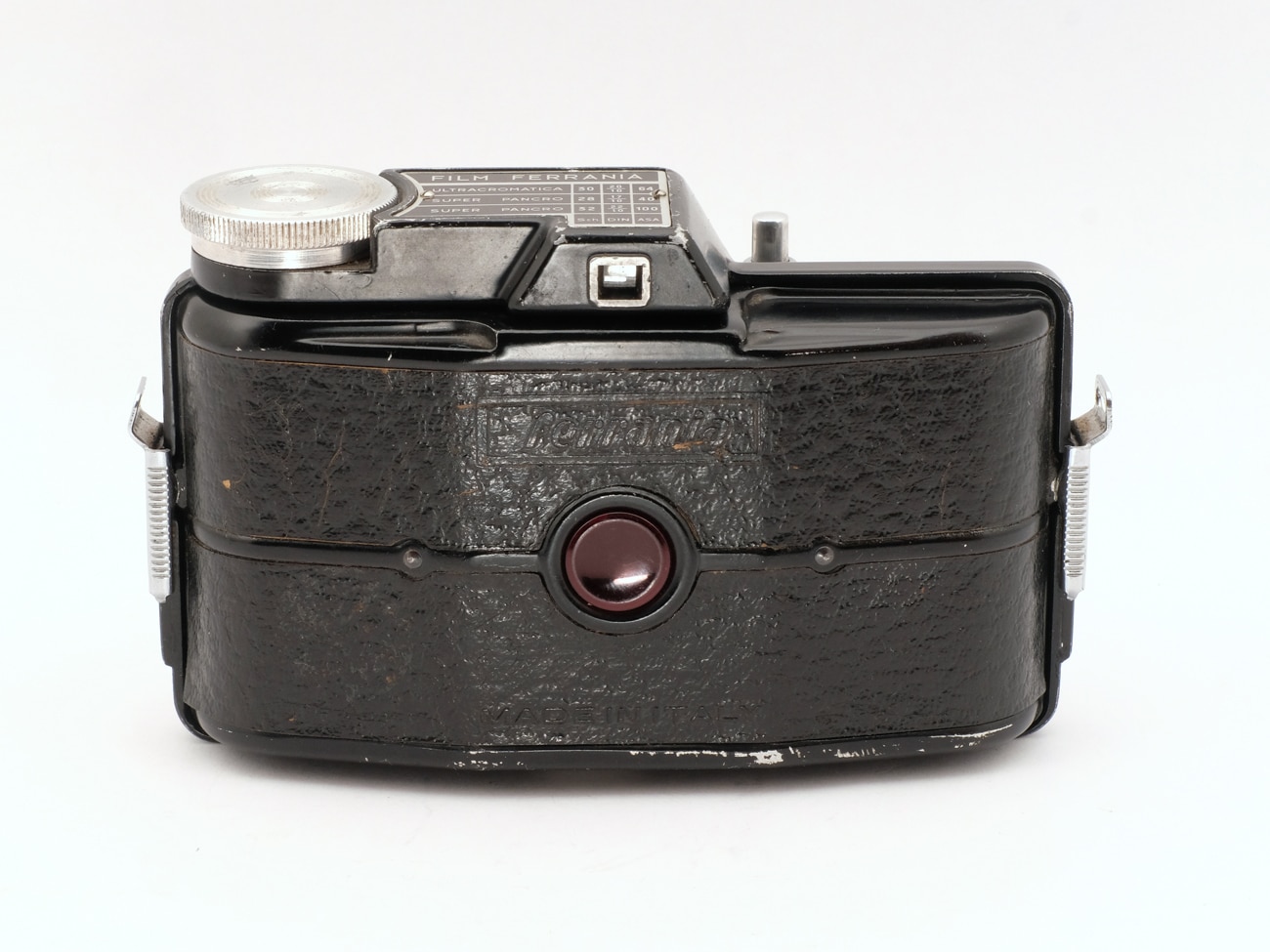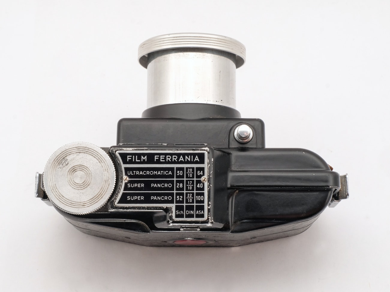 Kamera für Rollfilm 127, Format 4 x 6cm, hergestellt von Ferrania, Mailand, Italien, ab 1954. Das zweilinsige Fixfokus-Objektiv Ferrania Primar 7,5 cm, möglicherweise ein Frontar-Typ, ist versenkbar. Die Öffnung im Objektivträger, gleichzeitig die Festblende, hat einen Durchmesser von 5 mm, wodurch sich bei der vorhandenen Brennweite eine Lichtstärke von 1:15 ergibt. Der Einfachverschluss arbeitet mit einer Zeit von etwa 1/50 Sekunde. Schiebt man die beiden Trageösen nach unten, lässt sich die Rückwand komplett abnehmen. Die Filmauflageleisten sind gewölbt, um Randunschärfen zu reduzieren, der Objektivträger ist recht massiv aus Druckguss gefertigt. Auf der Gehäuseoberseite ist eine Tabelle mit drei Ferrania-Filmtypen und den zugehörigen Empfindlichkeiten angebracht. Ansonsten sind weder Drahtauslöseranschluss noch Blitzkontakt, Zubehörschuh oder Stativgewinde vorhanden.