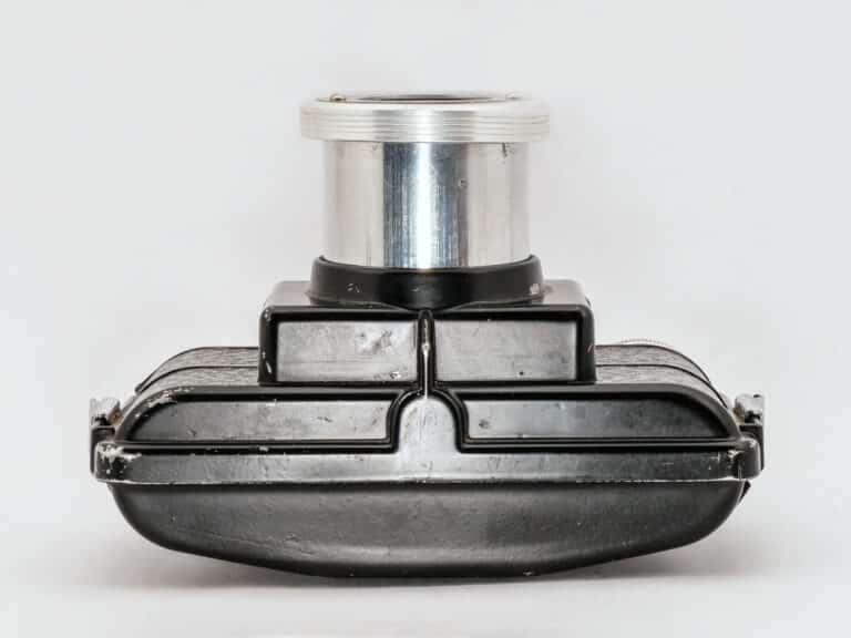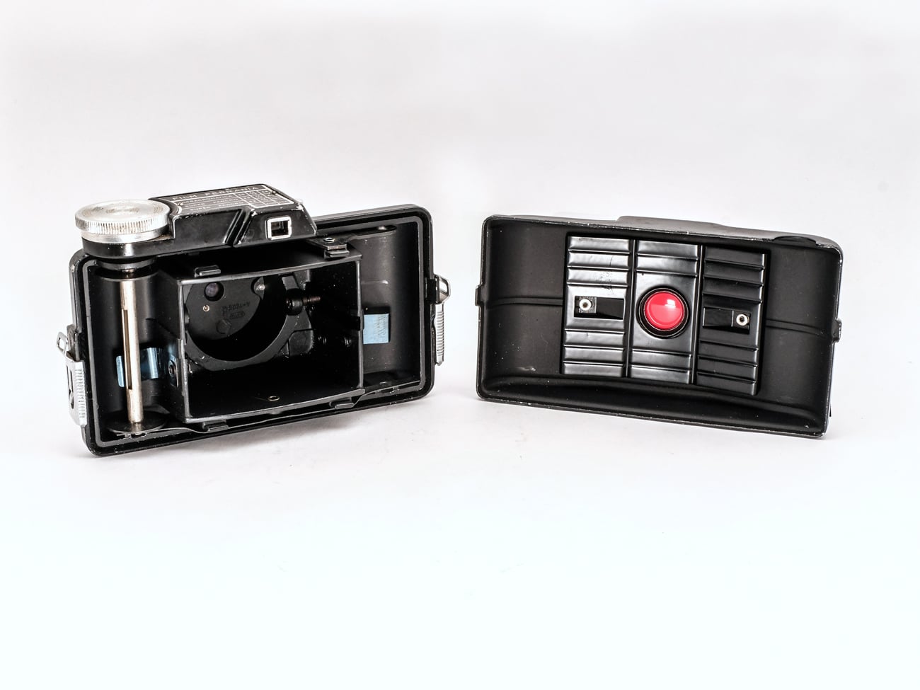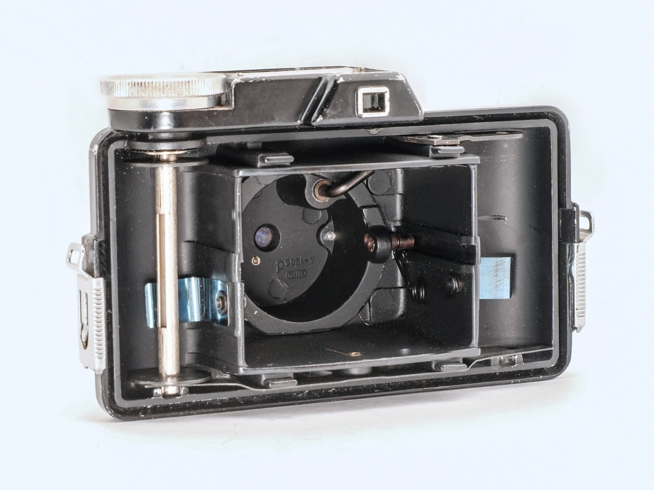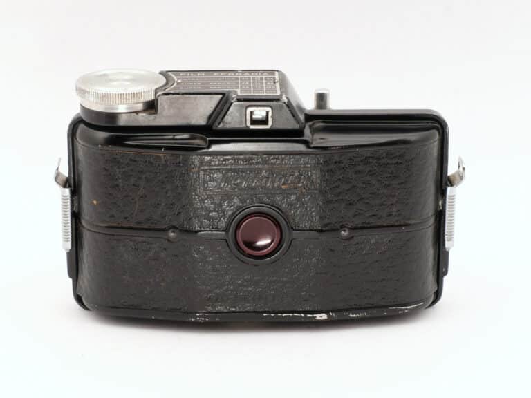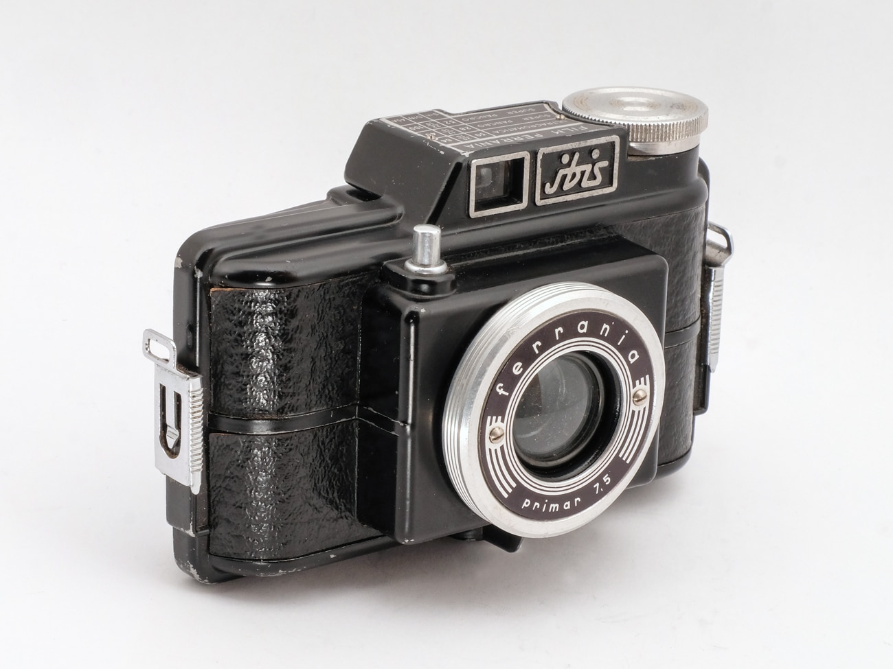 Kamera für Rollfilm 127, Format 4 x 6cm, hergestellt von Ferrania, Mailand, Italien, ab 1954. Das zweilinsige Fixfokus-Objektiv Ferrania Primar 7,5 cm, möglicherweise ein Frontar-Typ, ist versenkbar. Die Öffnung im Objektivträger, gleichzeitig die Festblende, hat einen Durchmesser von 5 mm, wodurch sich bei der vorhandenen Brennweite eine Lichtstärke von 1:15 ergibt. Der Einfachverschluss arbeitet mit einer Zeit von etwa 1/50 Sekunde. Schiebt man die beiden Trageösen nach unten, lässt sich die Rückwand komplett abnehmen. Die Filmauflageleisten sind gewölbt, um Randunschärfen zu reduzieren, der Objektivträger ist recht massiv aus Druckguss gefertigt. Auf der Gehäuseoberseite ist eine Tabelle mit drei Ferrania-Filmtypen und den zugehörigen Empfindlichkeiten angebracht. Ansonsten sind weder Drahtauslöseranschluss noch Blitzkontakt, Zubehörschuh oder Stativgewinde vorhanden.