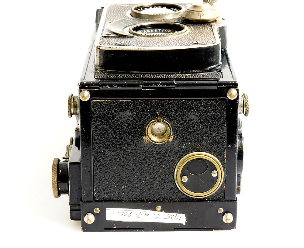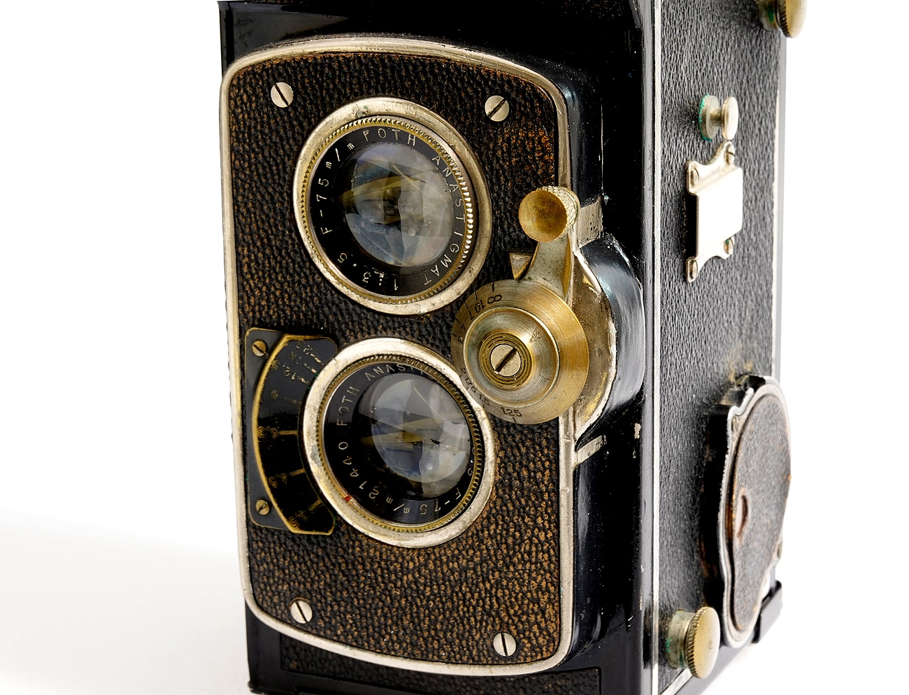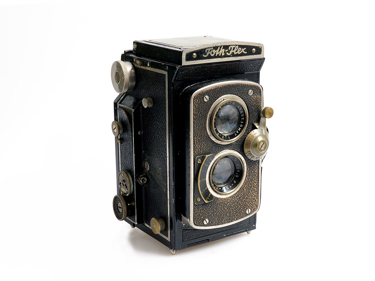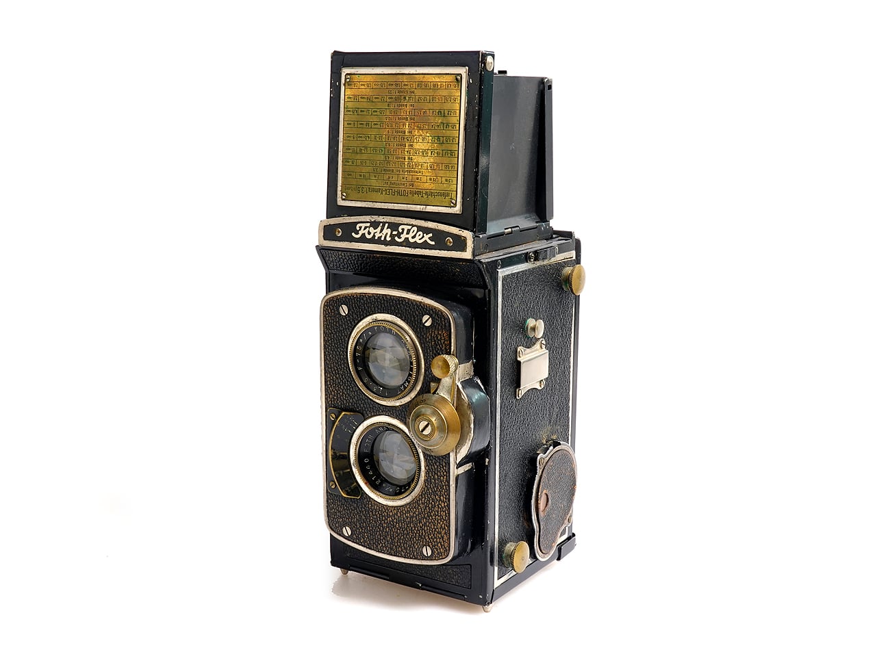 Zweiäugige Spiegelreflexkamera, hergestellt … . Objektive: Foth Anastigmat 1:3,5/75 mm, Seriennummer 21440 (Aufnahme); Foth Anastigmat 1:3,5/75 mm (Sucher). Tuchschlitzverschluss. Bildzählwerk?