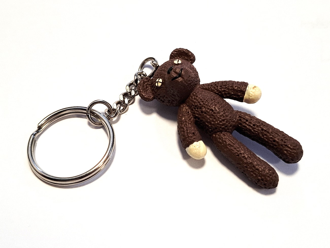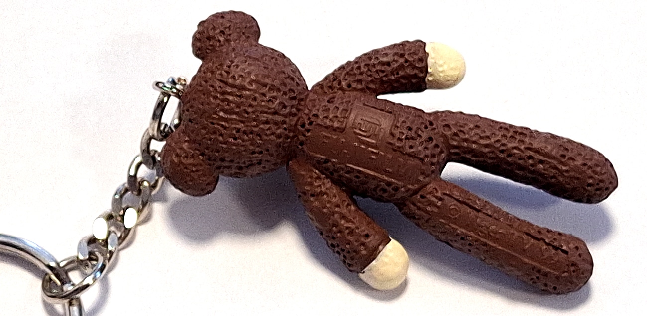 Ein Weltstar als Verkaufs-Kanone: 1999 warb der britische Komiker „Mr. Bean“, im bürgerlichen Leben Rowan Atkinson, europaweit im Fernsehen und in vielen Fotogeschäften für Fujifilms neue Superia-Farbfilmgeneration. Hier ein Schlüsselanhänger mit einer etwa 5 cm langen Kunststofffigur, unschwer erkennbar als der legendäre braune Teddybär von „Mr. Bean“.