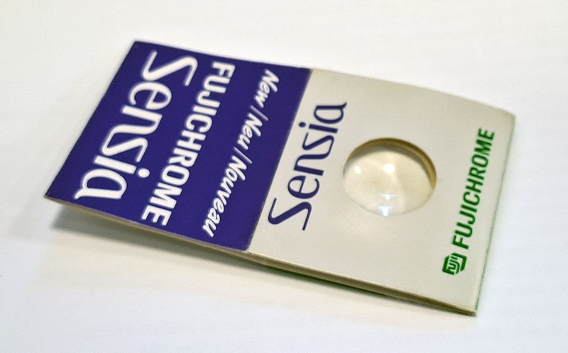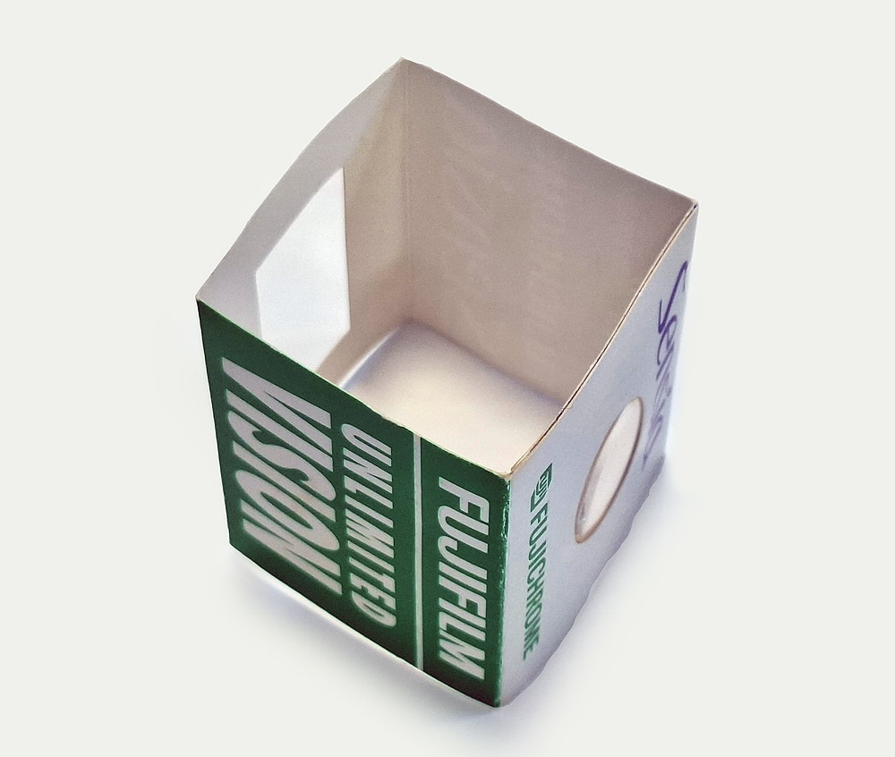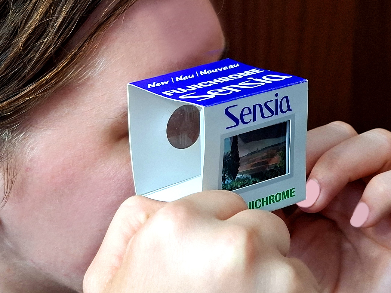Ein pfiffiges Give-away des japanischen Fotogeräte- und Filmherstellers Fuji als Werbemittel für den Farb-Diafilm Fujichrome Sensia, der in den 1980er Jahren auf den Markt kam und bis etwa 2010 verkauft wurde: ein einfacher Diabetrachter für Kleinbilddias aus Karton mit einer Kunststofflinse. Das faltbare „Gehäuse“ in Würfelform hat die Abmessungen von 5,5 x 5 x 5,5 Zentimeter und funktioniert höchst einfach. Wie im Bild zu sehen, schiebt man ein gerahmtes KB-Dia innen vor die 24 x 36 mm große Aussparung in der Rückwand, während man die Vorderwand mit der eingeklebten Linse ans Auge heranführt.