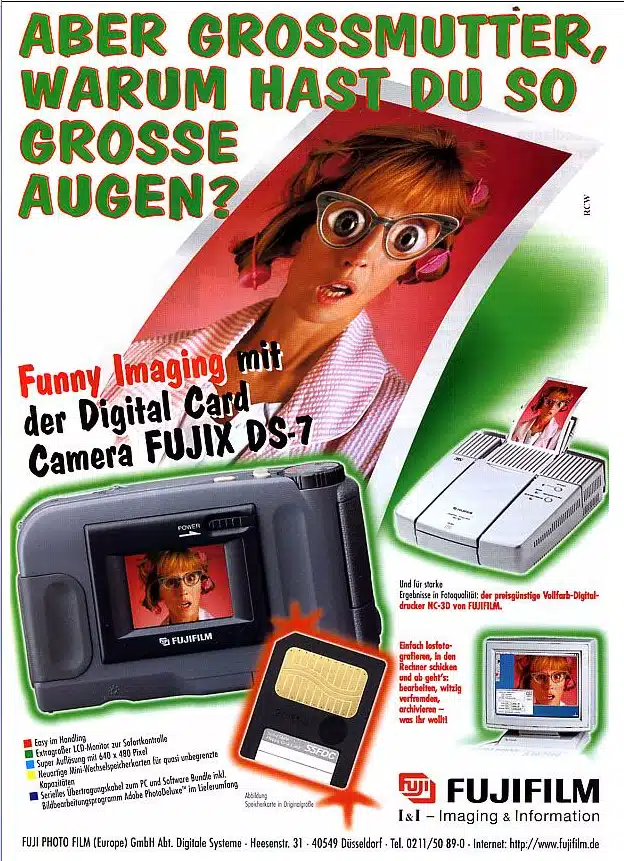 Eine prinzipiell unbedeutende Digitalkamera (0,3 Megapixel), aber im Jahre 1996 der Beginn des digitalen Zeitalters für den Journalisten und Kamerasammler Kurt Tauber: die Fujifilm DS-7. Objektiv: Fixfokus „TV-Fujinon Lens f = 5,7 mm“ (1:2,2/38 mm, umgerechnet auf Kleinbildformat). Verschlusszeitbildung über CCD- oder CMOS-Element. Schärfebereich: 45 cm bis unendlich. Nahaufnahmen/Makro: 9 cm bis 13 cm (Makroaufnahmen), 45 cm bis 90 cm (Nahaufnahmen). Lichtempfindlichkeit: ISO 100, Programmautomatik, 1,8-Zoll-LCD-Monitor. Selbstauslöser, Speicherung von Datum und Uhrzeit für jede Aufnahme; direkte Betrachtung auf TV-Monitor möglich, NTSC-Videoausgang. Schärfeverstellung Makro – Porträt – Fern, zwei Blenden, Belichtungsautomatik, wechselbare Speicherkarte Smart Media 2 MB. Zubehör: Tasche, PC-Kabel zum Überspielen der Bilder zum PC; CD-Rom mit Software.