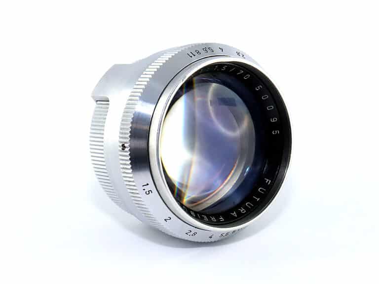 Weitere Wechselobjektive: Ampligon 1:4,5/35 mm, Tele Futar 1:3,8/75 mm, Tele Elor 1:3,8/90 mm und – wie hier im Bild – das äußerst lichtstarke leichte Tele Frilon 1:1,5/70 mm.