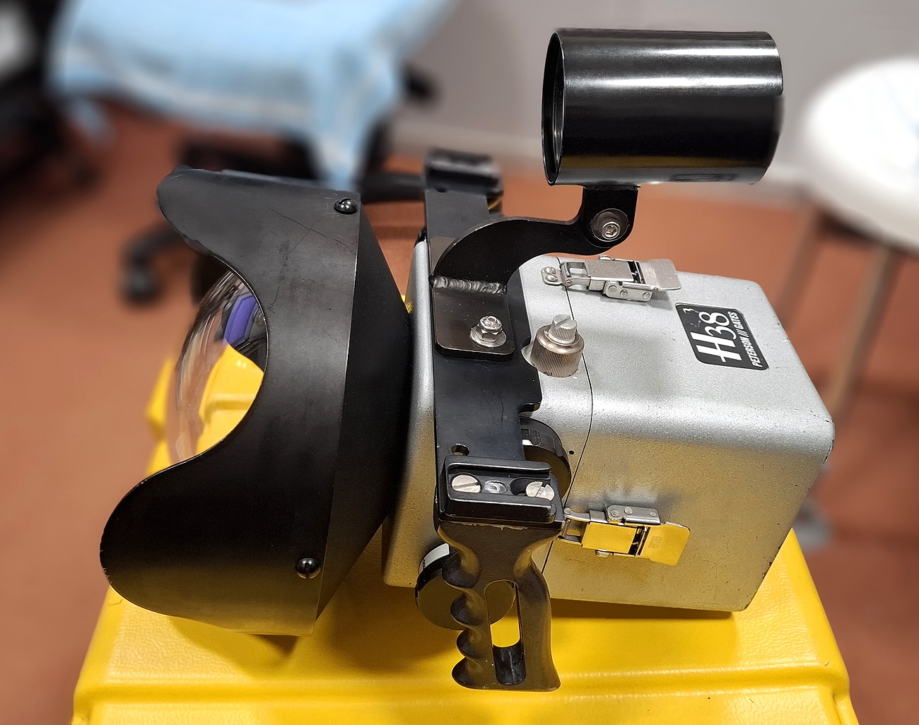 Wieder eine absolute Rarität im Deutschen Kameramuseum: ein Unterwassergehäuse des amerikanischen Premium-Herstellers Gates aus den 1980er/1990er Jahren. Das – so die offizielle Typenbezeichnung – „Peterson /// Gates H 38“ ist ein hochwertiges, robustes Unterwassergehäuse aus Aluminium, entwickelt für Hasselblad-Mittelformatkameras, insbesondere die SWC (Super Wide Camera) mit ihrem festeingebauten 38-mm-Biogon-Objektiv von Carl Zeiss Oberkochen. Vom 38-mm-Objektiv dürfte auch die Typenbezeichnung H 38 stammen: H für Hasselblad, 38 für dieses Ausnahmeobjektiv.
