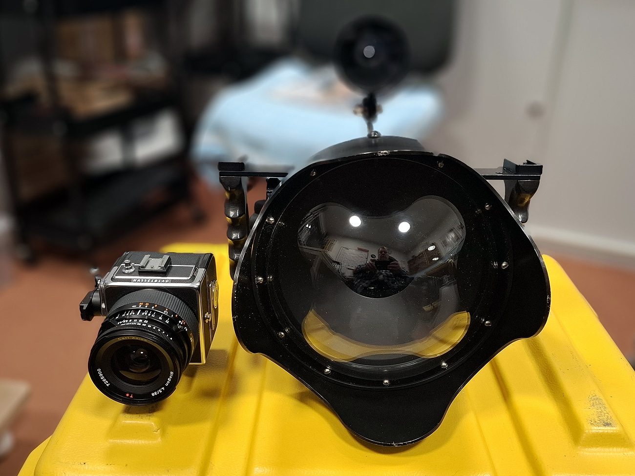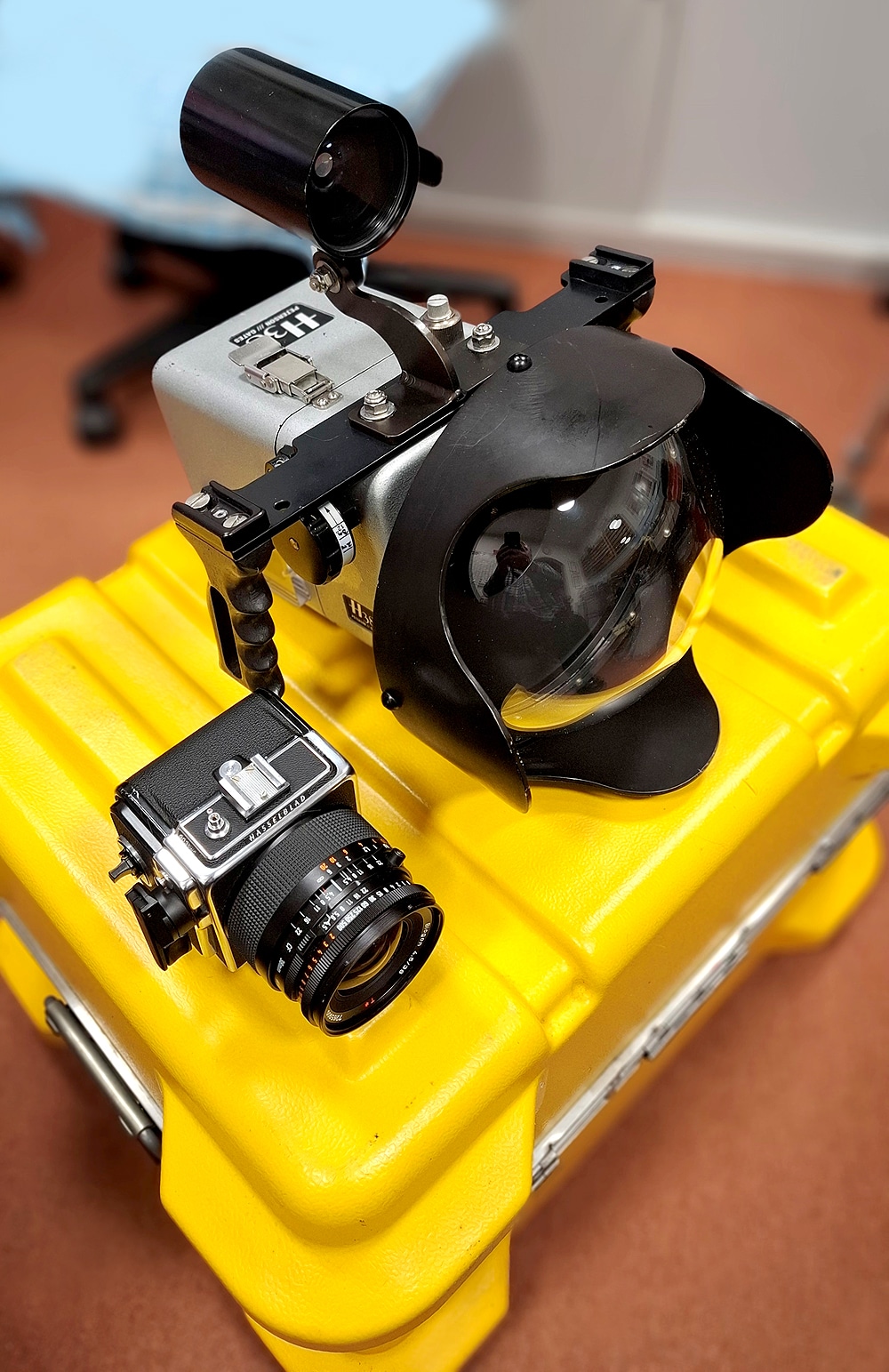 Das Gehäuse besteht aus gefrästem Aluminium, hart eloxiert, mit Epoxidharz lackiert für lange Haltbarkeit. Verschiedene Sucher waren lieferbar, hier ein optischer Sucher zum Anpeilen des Bildausschnitts, was unter Wasser ohnehin immer ein Problem war. Der Aufstecksucher der Hasselblad SWC ist natürlich nicht verwendbar und wird deshalb vor dem Einbau abgenommen. Das Tauchgehäuse ist geeignet für Tiefen bis zu 250 Fuß (76 Meter), geprüft bis 100 PSI (etwa 6,9 Bar) und verfügt über eine eingebaute Wassererkennung: Bei Leckagen ertönt ein akustisches Signal, um das wertvolle Equipment zu schützen.