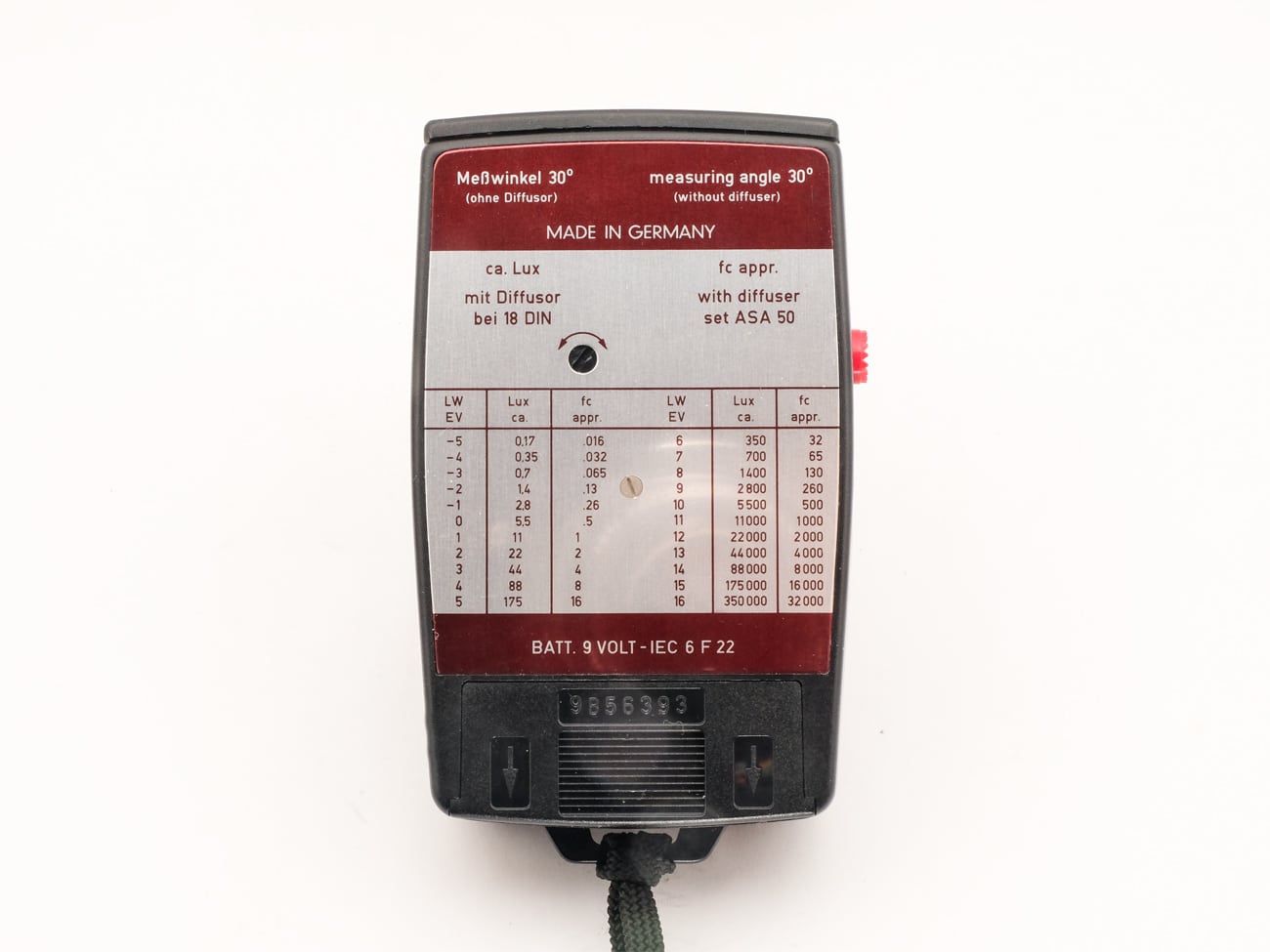Elektronischer Belichtungsmesser mit Silizium-Messzelle (Blue Cell) von Gossen, Erlangen, ab etwa 1985. Die Silizium-Fotodiode bietet, verglichen mit Selen- und CdS-Zellen, eine deutlich höhere Messempfindlichkeit und erlaubt damit Messungen bei extrem schwachem Licht. Siliziumzellen erfassen außer dem sichtbaren Spektralbereich auch UV- und IR-Licht, das durch einen Blaufilter gesperrt wird (Blue Cell). Zum Betrieb ist eine zusätzliche Stromquelle (9-Volt-Blockbatterie IEC 6 F 22) erforderlich. Das Messergebnis wird auf einem Zeigerinstrument nach dem Lichtwaage-Prinzip angezeigt. Durch Drehen des Messrades bringt man den Zeiger in Mittel-(Null-)Stellung und kann dann an den Skalen direkt die Messwertkombinationen ablesen. Durch Drücken der roten Taste (linke Seite) startet der Messvorgang, nach Loslassen bleibt die Anzeige für 30 Sekunden gespeichert. Sowohl Objektmessung alsa uch Lichtmessung ist möglich. Die – beachtlichen! –  Skalenwerte: Blenden 0,7 bis 128, Zeiten 8 Stunden bis 1/4.000 Sekunde, Lichtwerte – 8 bis +24, Empfindlichkeiten DIN 0 bis 51/ASA 0,8 bis 100.000, CINE 4,5 bis 144. Korrekturskalen für Lichtwerte bzw. Verlängerungsfaktoren sind ebenfalls vorhanden.