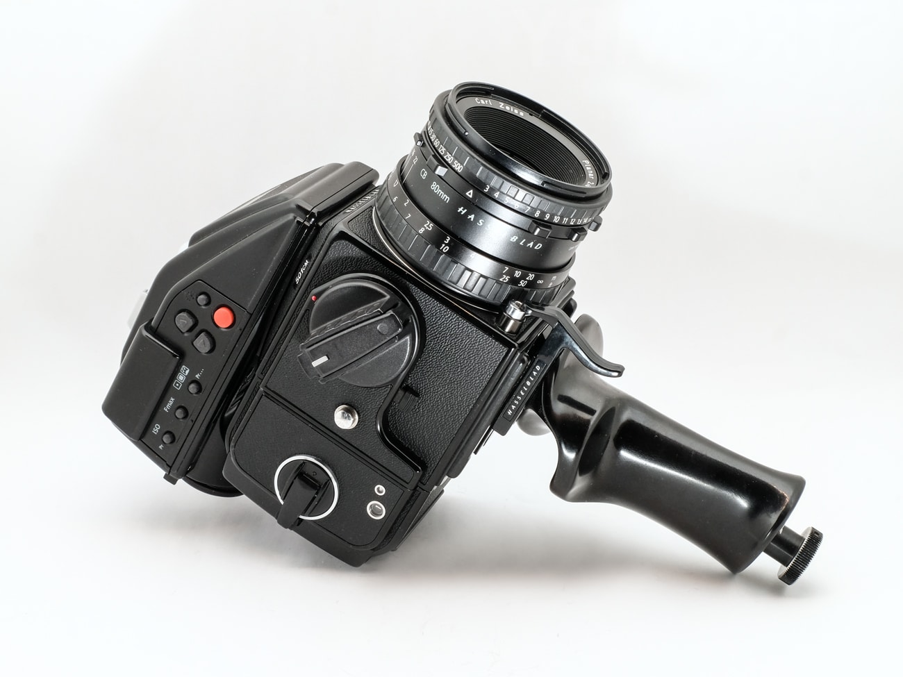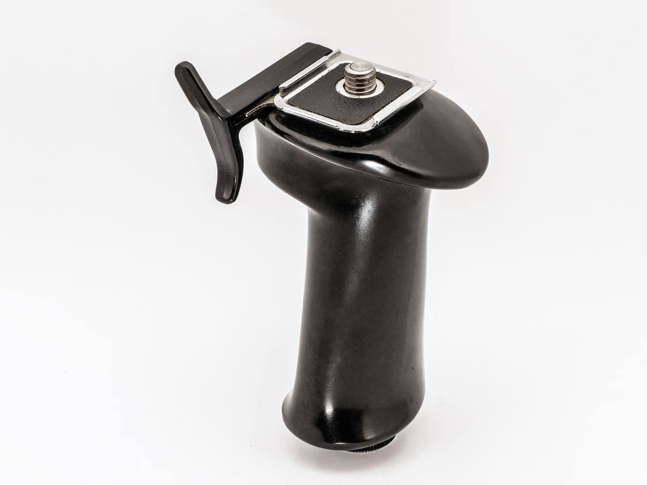 Pistolengriff für Hasselblad-V-Sytem-Kameras, produziert von 1965 bis etwa 1988, konzeptionell gedacht für die Anwendung zusammen mit Prismen- und Reflexsuchern mit Einblick von hinten. Er ist ergonomisch geformt, angepasst an die linke Hand, und betätigt direkt den Kameraauslöser. Die Befestigung an der Kamera erfolgt mit einer 3/8-inch-Schraube, die von der Unterseite des Griffs aus betätigt wird.
