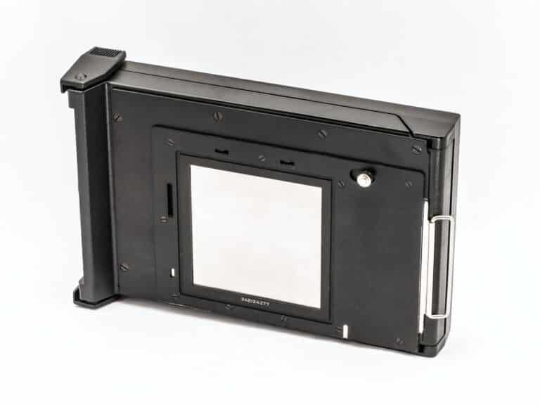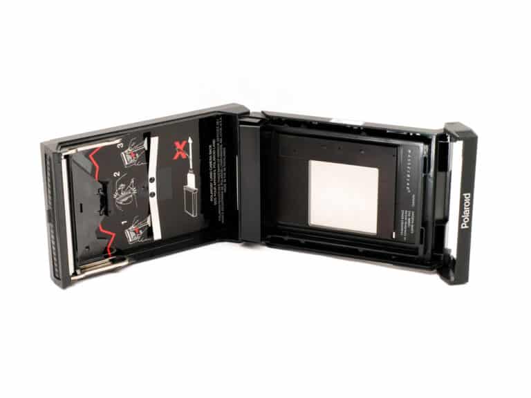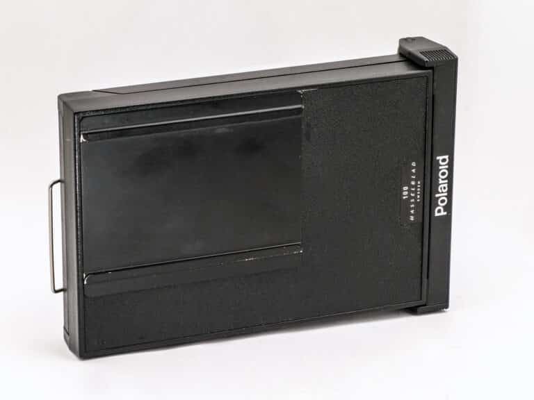 Magazin für Polaroidfilm 100 zur Verwendung als Rückteil an Hasselblad-V-System-Kameras, eingeführt 1997 mit einigen Verbesserungen gegenüber dem ab 1975 produzierten Vorgänger. Das hier vorliegende Modell wurde hergestellt in den Niederlanden. Das Standard-Hasselbladformat von effektiv 5,5 x 5,5 cm nutzt das Polaroid-Format von 7,3 x 9,5 cm nicht voll aus und ist zudem nach unten versetzt. Der Polaroid Filmpack 100 erzeugt ein Positivfoto. Das belichtete Bild wird manuell durch zwei Walzen gezogen, wodurch sich die integrierte Entwicklerflüssigkeit gleichmäßig verteilt und das Foto sich außerhalb der Kamera in wenigen Minuten entwickelt. Verwendet wurden solche Polaroid-Rückteile in der Regel in Fotostudios, um die Belichtung und die richtige Bildkomposition zu testen. Es gab Schwarzweiß- und Farbfilme.