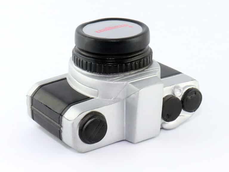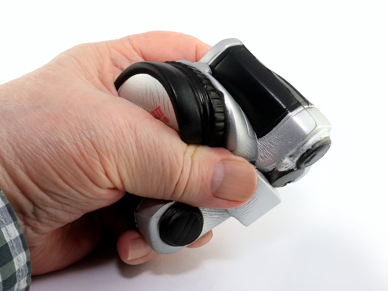 Sieht irgendwie aus wie eine kleine Fotokamera, ist aber nur ein Giveaway, das Museumsmitarbeiter Georg Klerner-Preiß auf der ersten Nürnberger „Imaging World 2025“ bei einem Messerundgang für die Kuriositätenabteilung des Deutschen Kameramuseums „abgestaubt“ hat. Damit kann man weder fotografieren, noch Nägel einschlagen, aber man kann dieses Gimmick nach einem Kollegen werfen, wenn der einen mal wieder ärgert: Es besteht aus einer Art Schaumstoff…