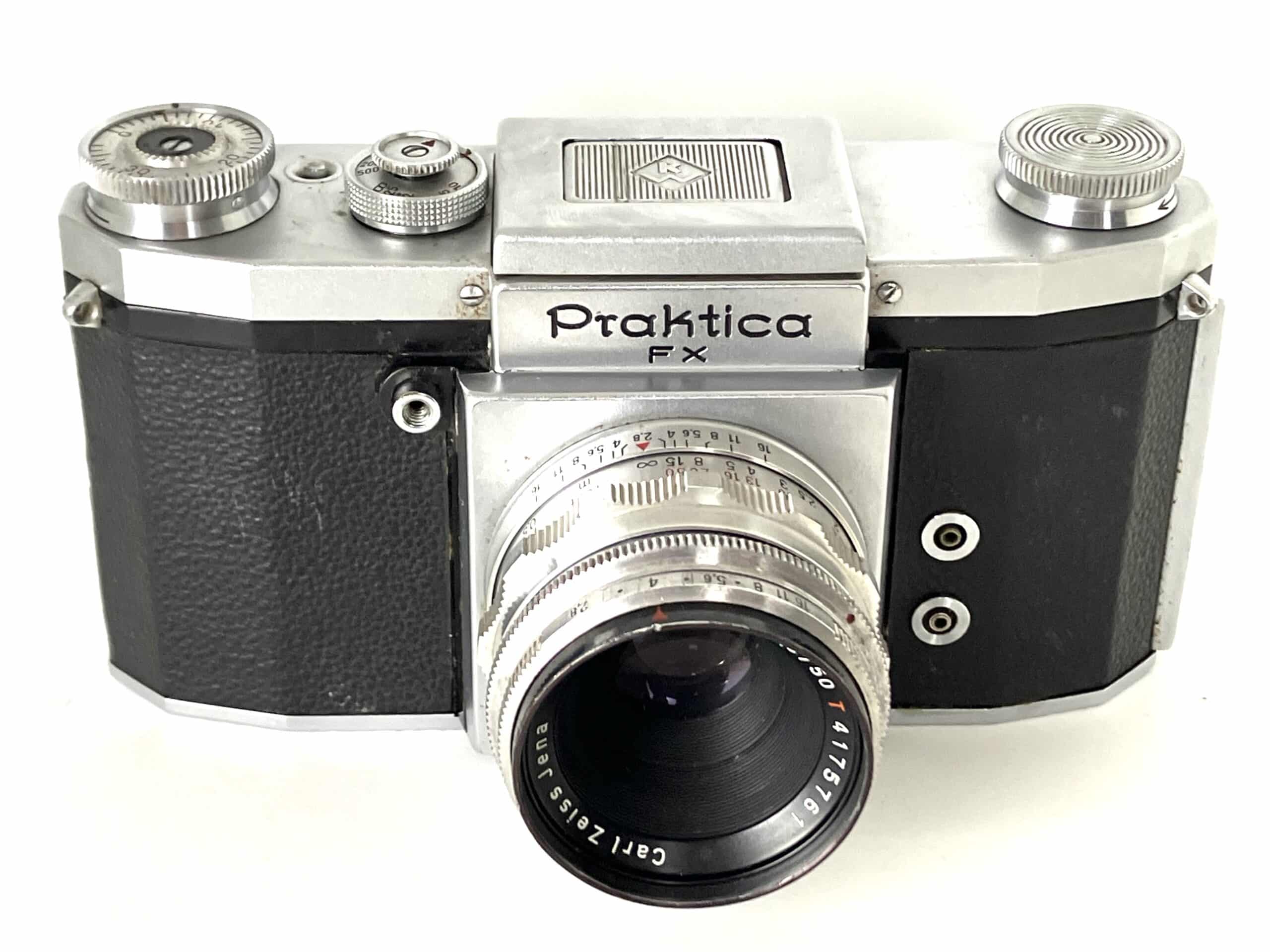 Diese Praktica FX von 1954 unterscheidet sich von ihren Vorgängerinnen durch ihre Blitzkabelanschlüsse mit Blitzsynchronisation, hier mit zwei Koaxialbuchsen (F und X). Die ersten Praktica hatten keine, dann einpolige Blitzbuchsen. Ansonsten bietet die Kamera das Aussehen und die technischen Leistungen ihrer Vorgängerinnen mit einem Tuchschlitzverschluss und Belichtungszeiten von 1/2 bis 1/500 Sekunde sowie B. Sie ist eine einäugige Spiegelreflexkamera für Kleinbildfilm 135 und hat ein M 42-Gewinde als Objektivanschluss. Sie ist hier mit dem Standardobjektiv Carl Zeiss Jena Tessar 1:2,8/50 mm mit manueller Vorwahlblende ausgestattet.
