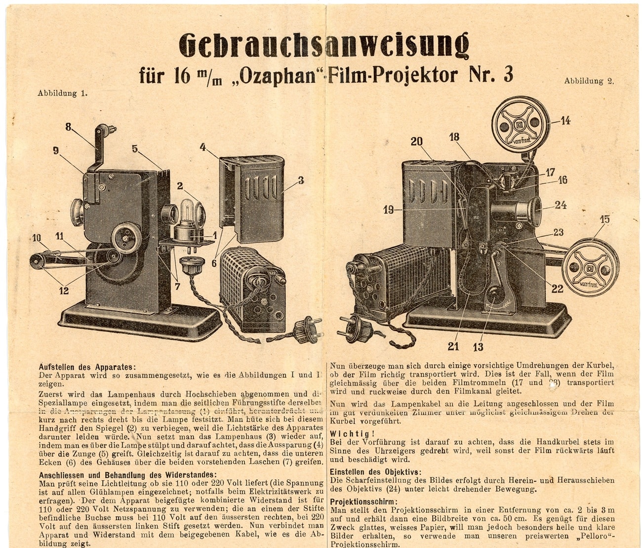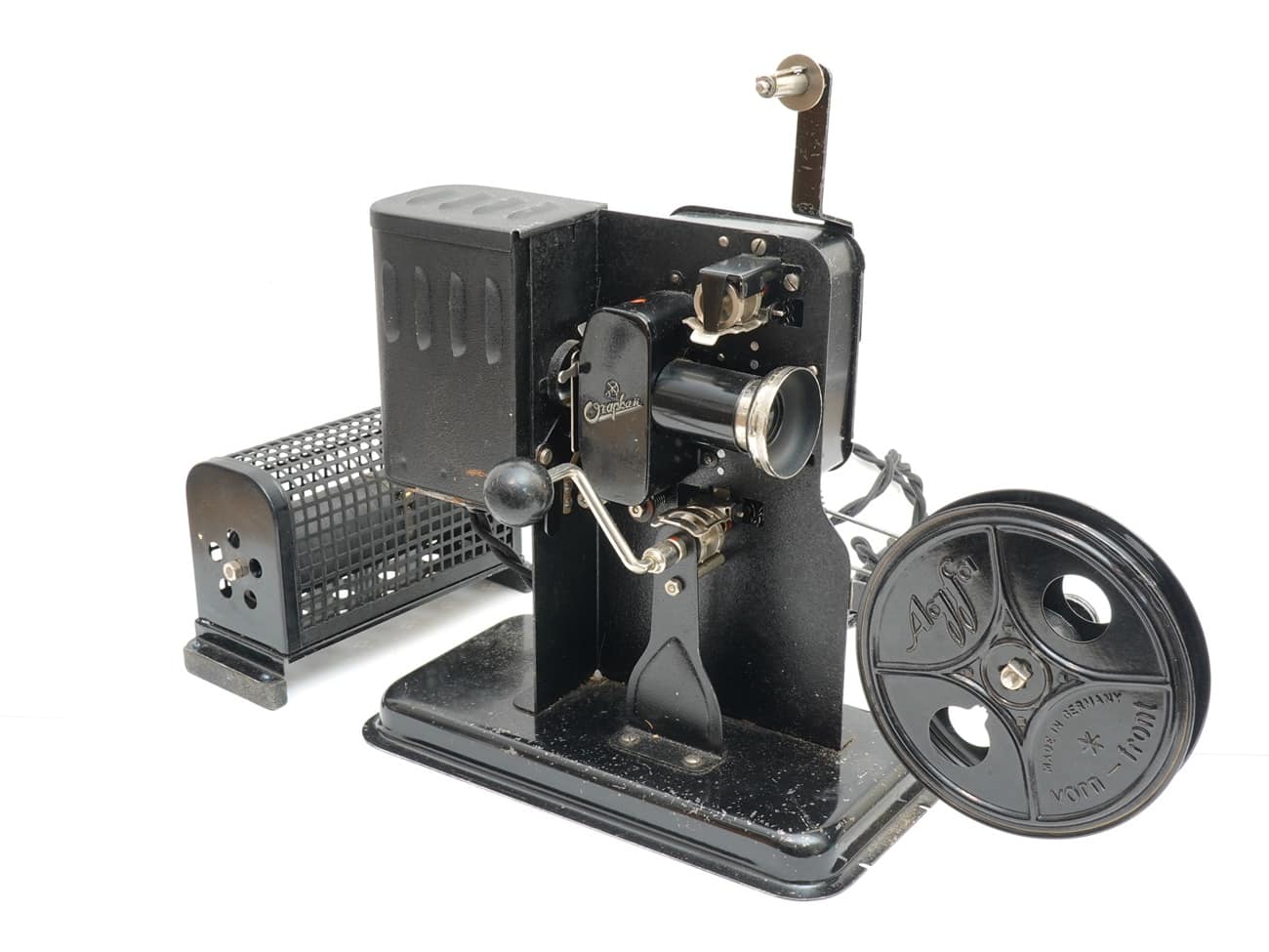 Projektor für Ozaphan-Kauf-Filme (16 mm), hergestellt vermutlich bei Ernst Plank in Nürnberg. Separater Vorwiderstand für die Beleuchtung; manueller Filmtransport mittels Handkurbel. Bei diesem Exemplar ist die Verkabelung noch im Originalzustand erhalten. Im Museum mit Gebrauchsanleitung.