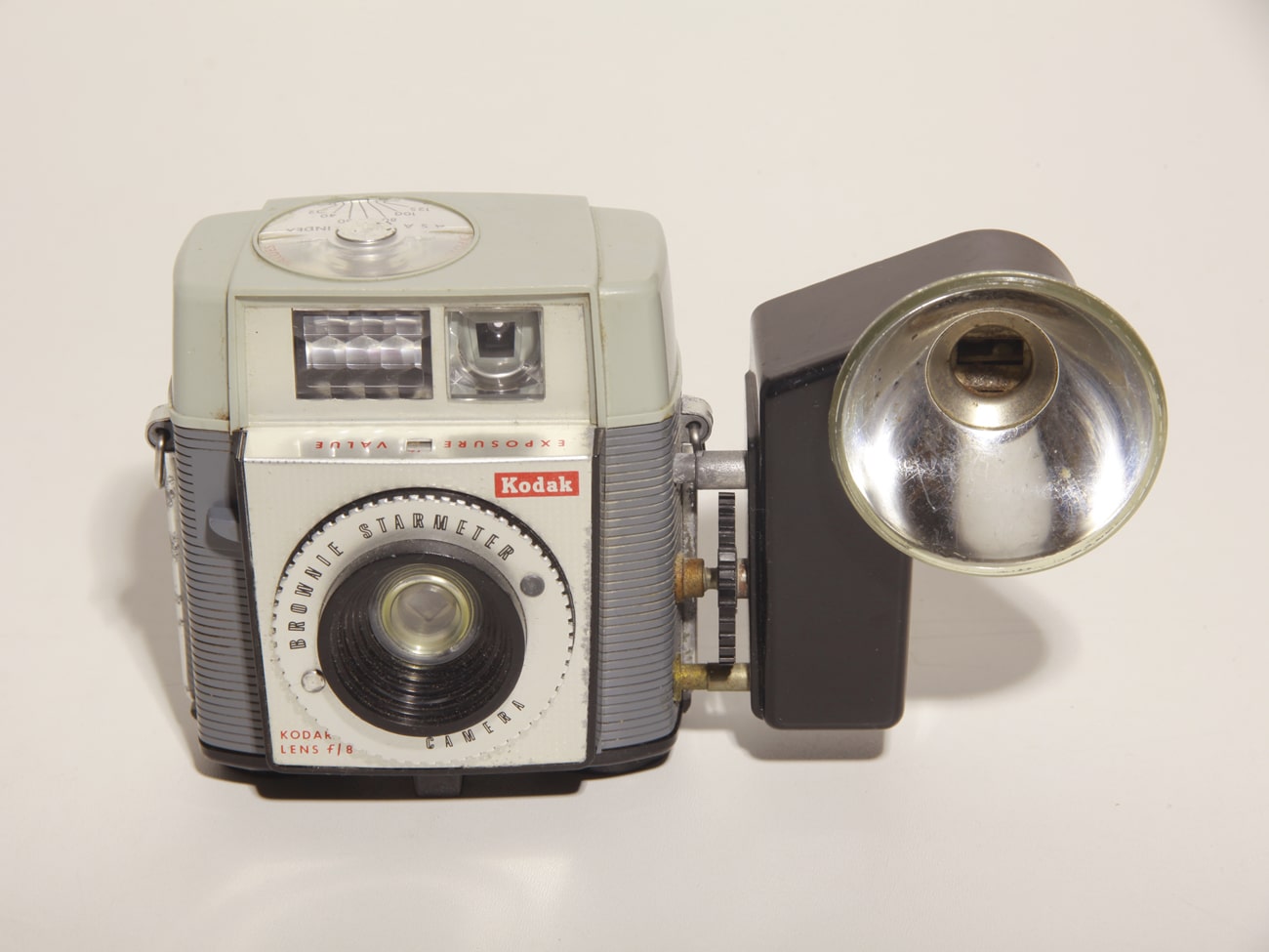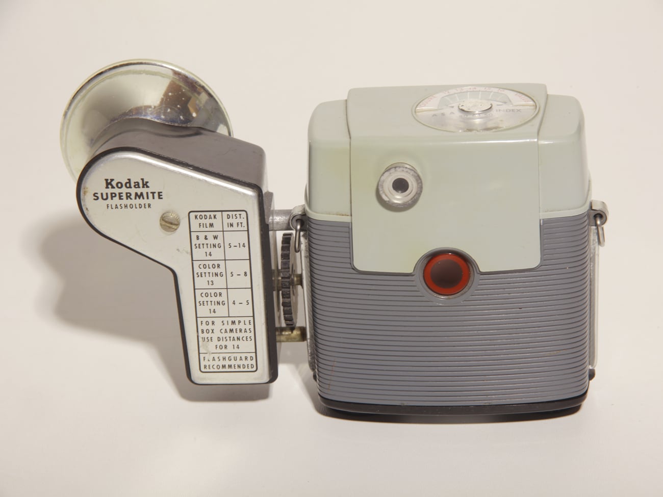 Interessante (Box-) Kamera für Rollfilm 127, Format 4 x 4 cm, produziert von Kodak in den USA ab 1960 bis etwa 1965. Der eingebaute Selen-Belichtungsmesser arbeitet mit Empfindlichkeiten von ASA 32 bis ASA 125. Die an einem Zeigerinstrument auf der Oberseite abzulesenden Lichtwerte reichen in 5 Stufen von 12 bis 16 und sind mit dem großen gezahnten Ring auf das Objektiv zu übertragen (Sichtfenster). Das Fixfokusobjektiv Kodar 1:8/44 mm arbeitet ab 1,8 Meter bis unendlich. Der einfache Rotationsverschluss ist mit einer Doppelbelichtungssperre ausgestattet. Der Auslösehebel befindet sich rechts neben dem Objektiv. Das Museumsmodell ist mit dem Blitzgerät Kodak Supermite für Blitzlampen (AG-1) bestückt, mit dem Aufnahmen von 1,5 bis 4,5 Meter möglich sind.